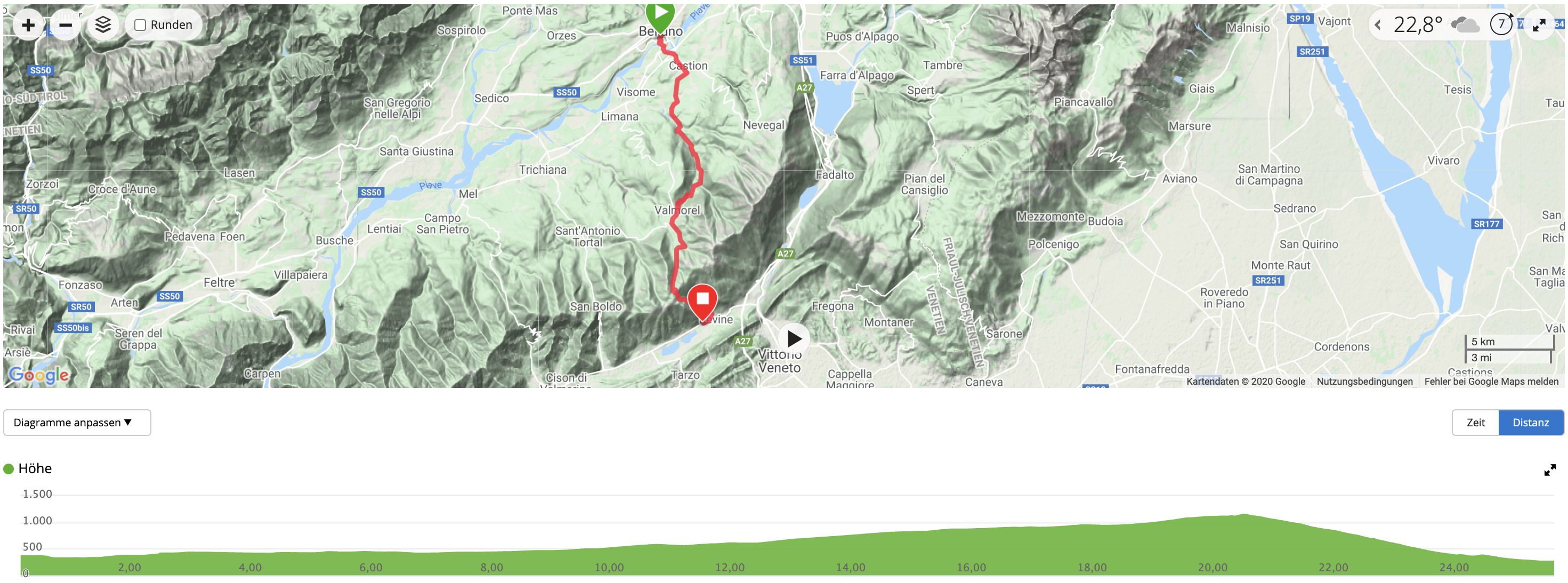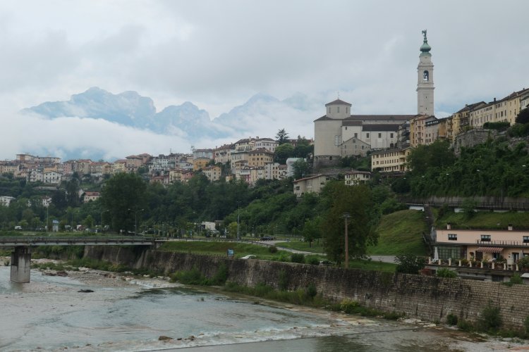 Rückblick auf Belluno nach unserem Start heute früh in der dortigen Altstadt. Die Reste der nächtlichen Gewitterwolken sind im Hintergrund noch deutlich zu sehen