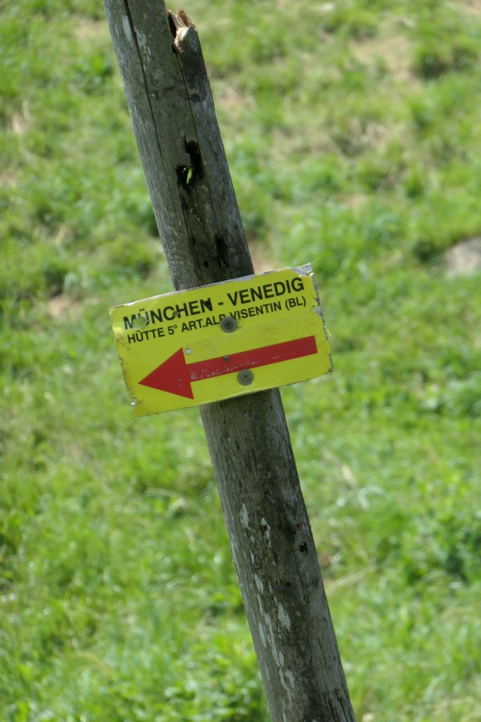 Direkt gegenüber unseres Rifugios geht’s von hier oben als Direttissima-Weg abwärts nach Revine. Der Weg ist kaum erkennbar und die Wegweisung ist minimal – aber…. hier ist tatsächlich ein Wegweiser nach „Venedig„ (rechts)!!