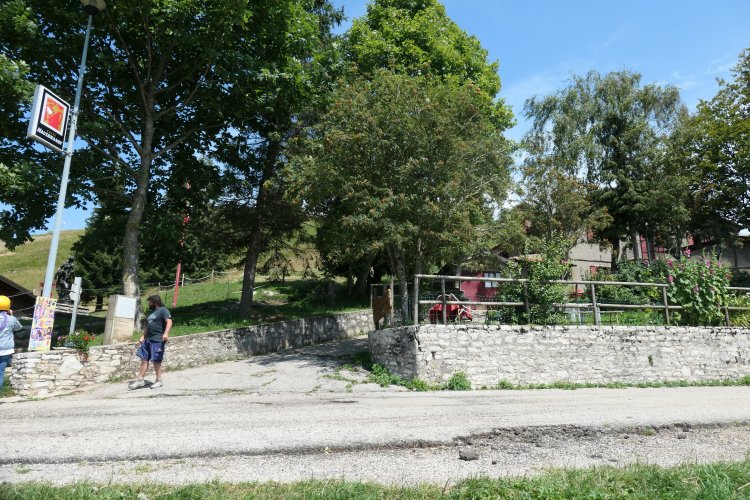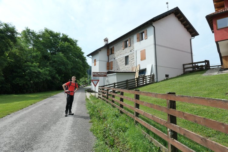 Der Weg dorthin führte zunächst über Kleinstraßen und durch kleine oder auch winzige Dörfer, aber dabei zunehmend bergauf. Ab dem kleinen Ort Valmorel ging es schließlich über eine Sackgassenstraße mit vielen grillenden Wochenendausflüglern bis die kleine Straße schließlich an der Alm (Malga) Montegal endete und in einen zunehmend steileren Wanderpfad überging, über den wir danach aber sehr schnell den Pass und damit unseren Treffpunkt mit Ines erreichten.