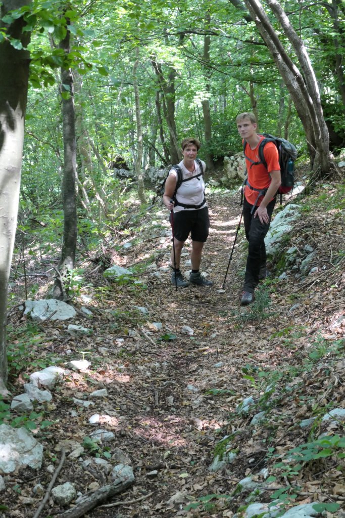 Auf einem solchen alten Militärweg geht’s abwärts nach Revine: Mehr und mehr Buchen und immer lauter werdende Grillen treffen wir hier an