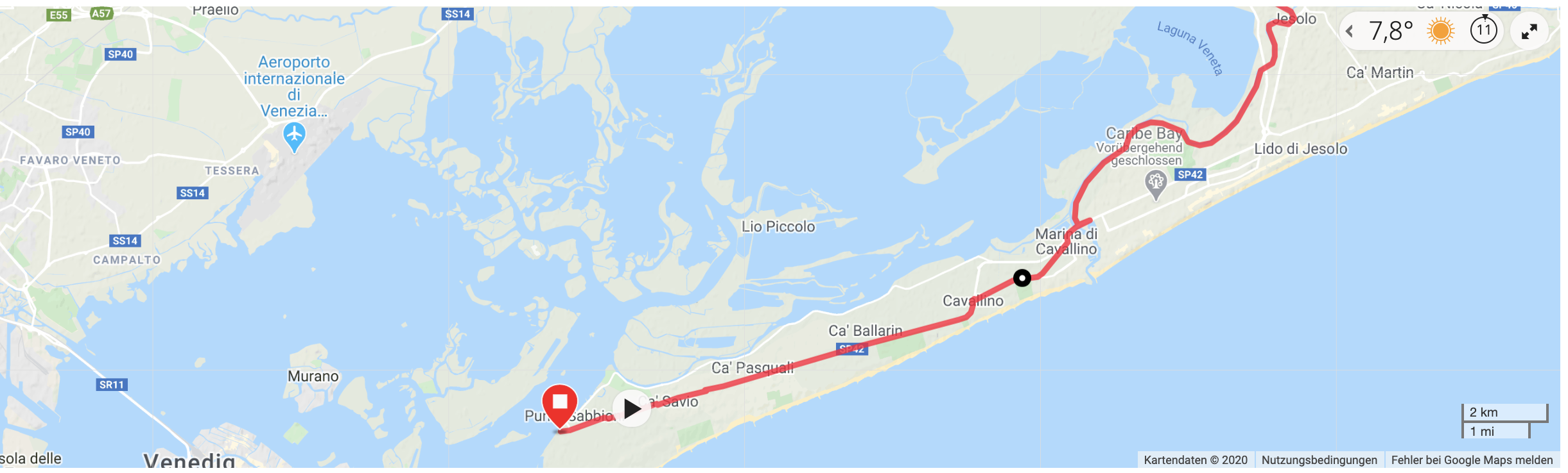 Vor diesem Hintergrund ging es auf der finalen Wegstrecke heute „nur noch“ die ca. 23km auf der Halbinsel vor der Fähre, südwestwärts von Jesolo nach Punta Sabbioni, bevor wir uns am Fähranleger des Markusplatzes schließlich ins Getümmel der Lagunenstadt stürzten.