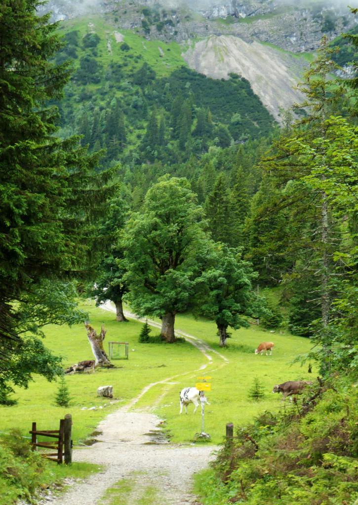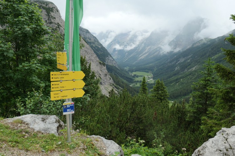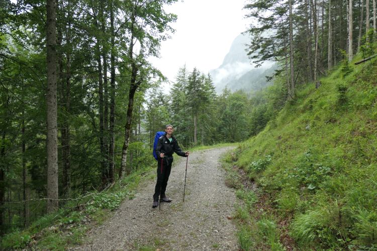 Ohne viel Pause und mit „Regenbeschleunigung“ ging es gut voran, nachdem wir den einzigen Abschnitt auf einem „echten“ Wanderpfad bereits nach einer guten Stunde hinter uns gebracht hatten und wir von da an mehr oder minder Wirtschaftswege zu begehen hatten. Auf dem Wanderpfad zuvor gab es allerdings durchaus sehenswerte Wegabbrüche, die bei der Nässe „etwas spannend“ umgangen werden mussten. Nach dem Erreichen des auch bei schlechtem Wetter sehenswerten „Kleinen Ahornbodens“ und dem daran anschließenden Weg direkt zu unserem höchsten Punkt heute auf dem „Hochalmsattel„, waren wir so letztlich schon um 13:20h an unseren Tagesziel, 890m höher und der Germknödel war dort gerade richtig warm für uns!