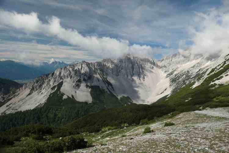 Blick zurück zur Birkkarspitze, bevor wir uns ins Inntal stürzen und vom Karwendel verabschieden