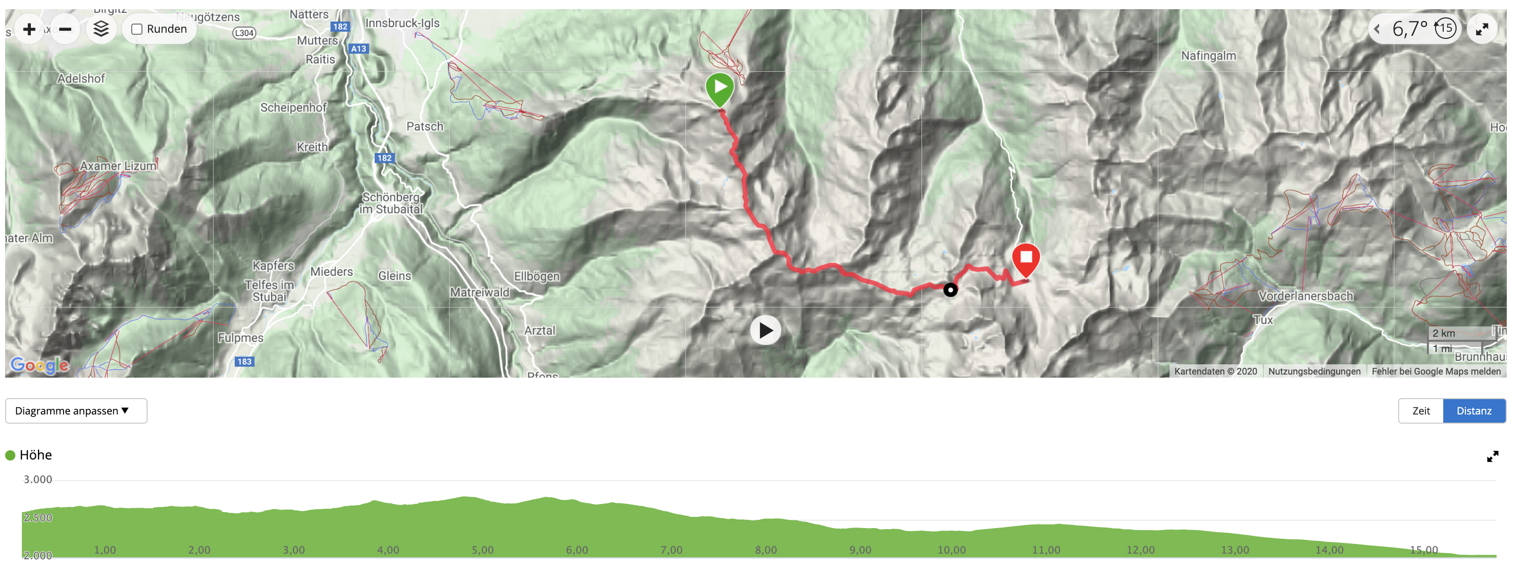 Für heute war seit Tagen das Überqueren einer Kaltfront im Nordalpenraum angekündigt. Erschwerend kam für uns hinzu, dass unsere ursprünglich geplante Route zur Lizumer Hütte, der „Gwannsteig„, wegen Steinschlag-Gefahr seit einiger Zeit nicht mehr begehbar und daher gesperrt war.