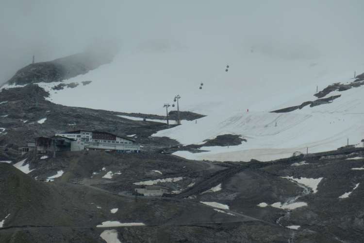 Blick vom Tuxerjochhaus auf die Umweltsünden des Sommer-Skizirkus am Hintertuxer Gletscher: Hier müssen wir morgen vorbei auf unserem weiteren Weg nach Süden