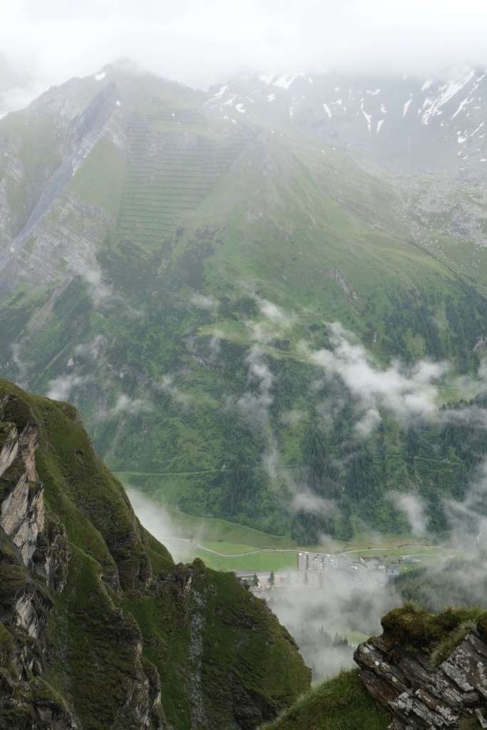 Kurzer Tiefblick auf Hintertux ganz unten und die Lawinenschutzverbauungen an den steilen Grashängen oberhalb des Ortes