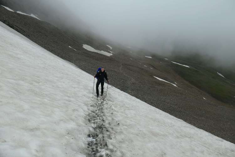 Je näher wir dem Sattel kamen und je höher wir stiegen, umso mehr steckten wir in den Wolken, die zunehmend auch Regen über uns ausschütteten. Der Regen hatte aber den Vorteil, dass die steilen Schneefelder auf dem Weg zum Geierjoch recht weich und gut zu spuren waren. So erreichten wir das Geierjoch zügig schon nach 1h 45min anstatt der veranschlagten 2,5h. Auf der anderen Seite des Joches ging es zunächst wieder ca. 150m bergab zum Junssee, im obersten Junstal. Dieser südseitige Abstieg vom Joch war schneefrei und daher schnell begangen.