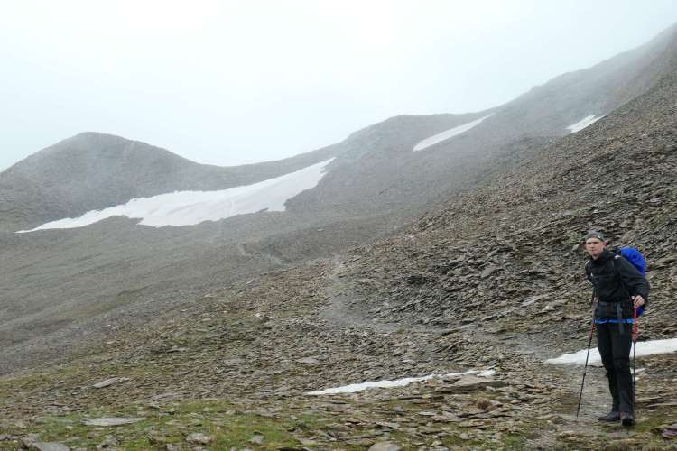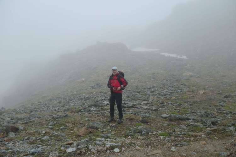 Carsten im regnerisch-nebligen Aufstieg zum Geierjoch, im Talschluss südlich der Lizumer Hütte