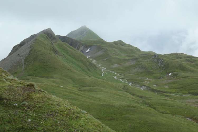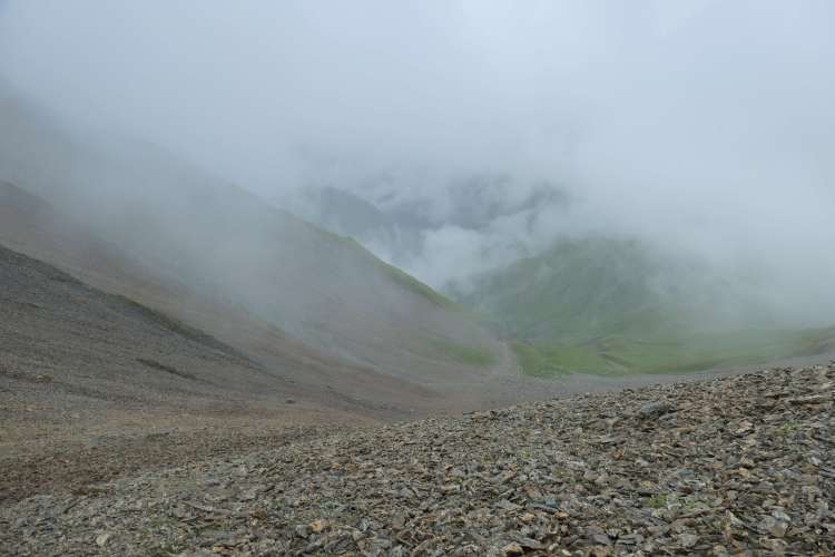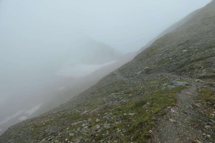 Auf der Südseite der Scharte wieder dichterer Nebel, aber ein bequemer Weg hinunter ins hinterste Tuxer Tal