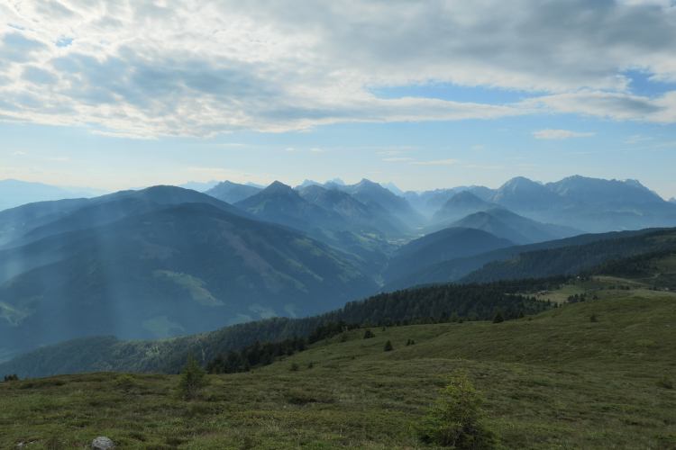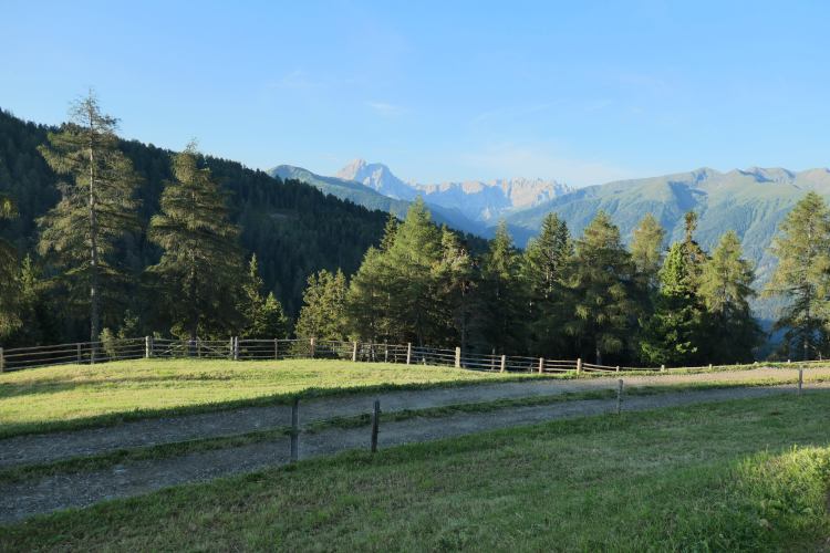 Blick zurück von der Lüsener Alm zum Alpenhauptkamm mit Hochfeiler und Hochferner (Zillertaler Alpen), von wo wir nach Südtirol gekommen sind
