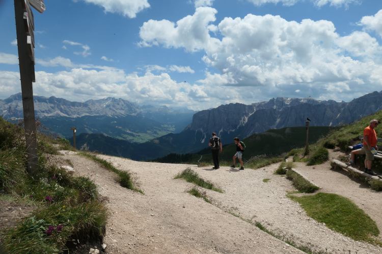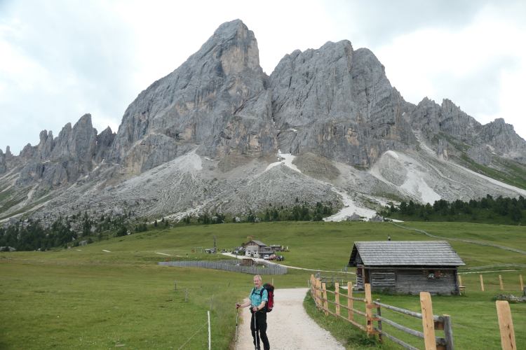 Heute stand eine lange (22km) Etappe mit zahlreichen Auf- und Abstiegen (insges. 1275m rauf und 910m runter) auf dem Plan: Von der Kreuzwiesenhütte (1920m) ging es über den Campill (2175m), Glittnerjoch, Turnaretschhütte, Maurerberghütte, Lüsener Joch und schließlich das Würzjoch hinein in die Dolomiten zum Peitlerjoch und von dort schließlich zur Schlüterhütte. Eine Gegend, in der weiterhin „Ladinisch“ als Muttersprache gepflegt wird und zahlreiche Bezeichnungen dementsprechend „interessante“ (aber mehrsprachige) Bezeichnungen (z.B. „Ütia“ = Hütte) zeigen.
