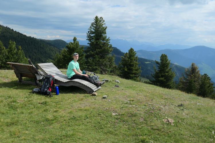 Eine „Traumpfad-Pausenbank“ unweit der schönen Maurerberghütte (2158m) nach ca. 10km. Von hier nur noch runter zum Würzjoch und dann geht’s aufwärts zum Peitlerkofel und dessen westlich gelegenen Scharte, der Peitlerscharte (2360m)