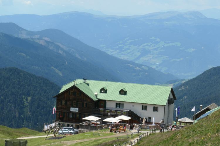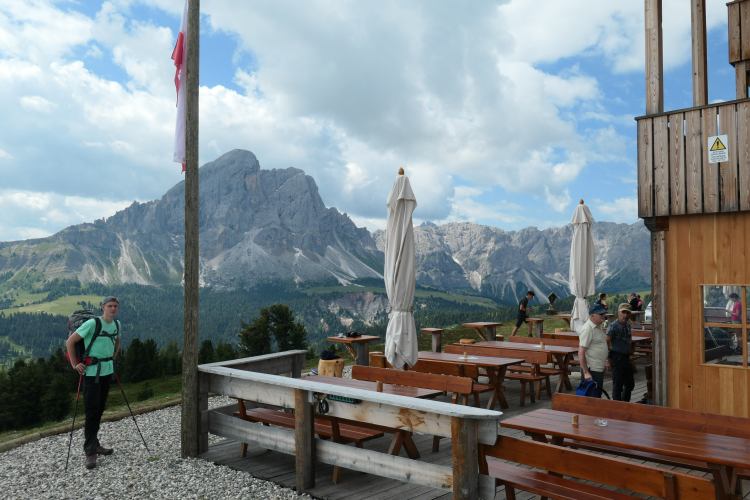 Die am Vormittag noch recht leere Terrasse der Maurerberghütte mit dem herrlichen Blick auf den Peitlerkofel