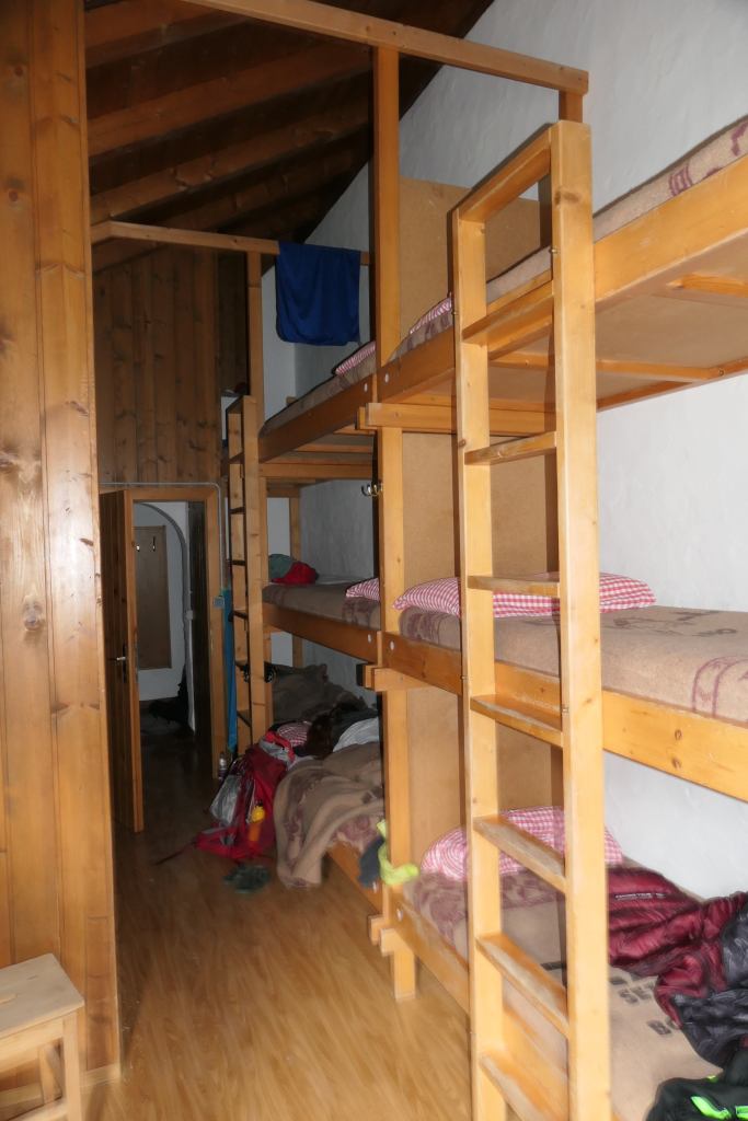 Unser Mehrbettzimmer in der Puezhütte, …..mit 3-fach Etagenbetten, die aber Corona-bedingt nicht voll belegt waren