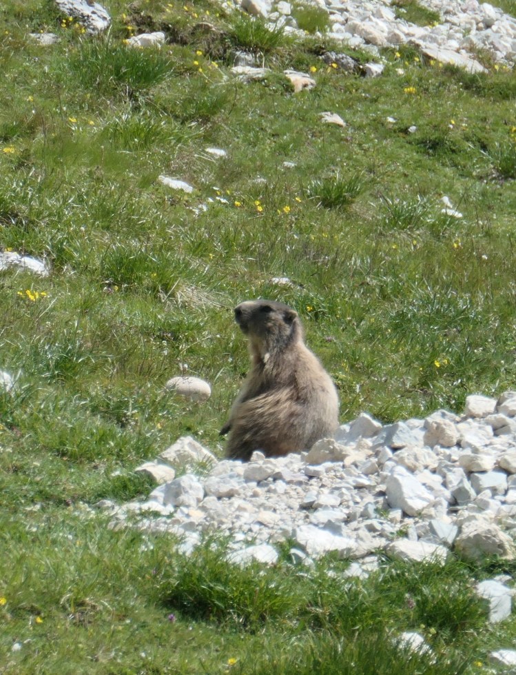 Nach der Forcella Nives lief dann der weitere Weg zum Tagesziel, der Puezhütte am Ende des Langentales, wieder durch sanfte Wiesen- und Schafgründe, die auch bei Murmeltieren immer sehr beliebt scheinen.
