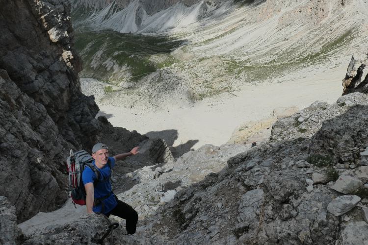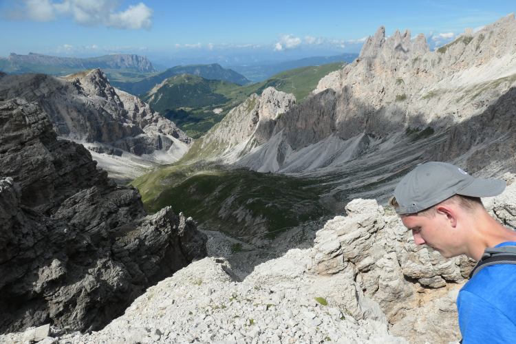 Heute ging’s definitiv in die Dolomiten. Das heißt, dass wir auch unseren ersten Dolomiten-Klettersteig zu bewältigen hatten: Den Aufstieg zur Forcella Nives (2720m). Vorher ging es jedoch auf dem Weg zum Kreuzjoch zunächst gleich von der Schlüterhütte weg durch herrliche Edelweißwiesen, wo sich uns ein wunderbarer Blick hinunter auf St. Magdalena im Villnößtal (Heimat von Reinhold Messner – noch mit einer kleinen Wolke versehen) bot. Vom Kreuzjoch aus ging es danach zunächst flach und später sehr steil über den typischen, weißen Dolomitenschotter aufwärts in die Roa-Scharte, von wo aus schon der Blick auf unsere heutige Klettersteigwand vor der Forcella Nives sichtbar war.