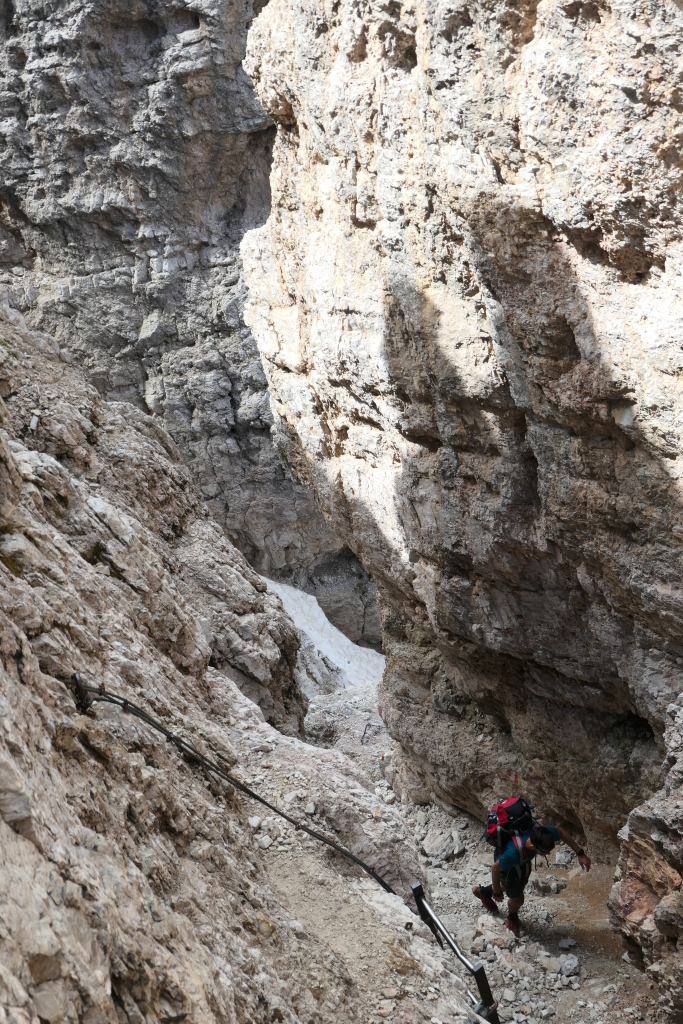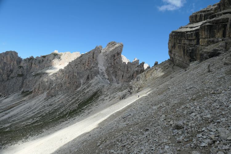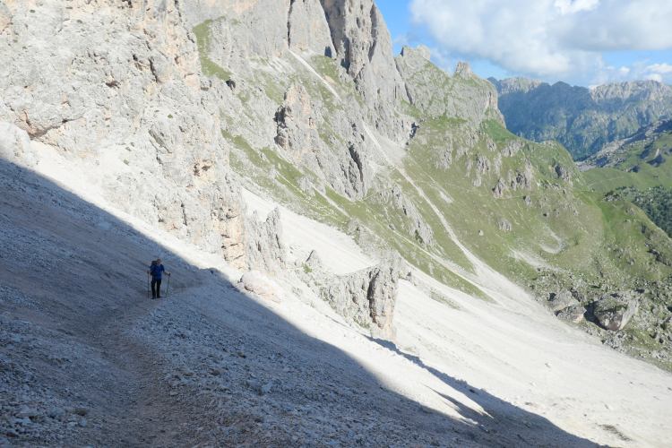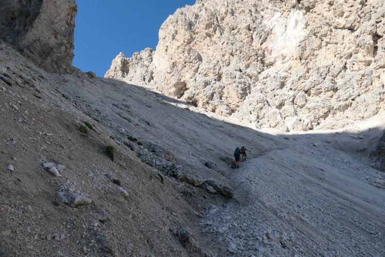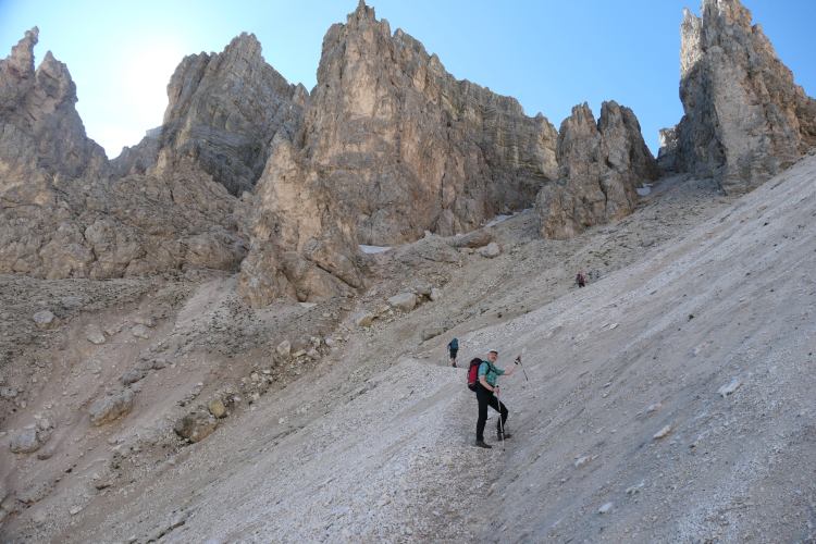 Auf dem weißen Dolomitenschotter beim Aufstieg zur Roa-Scharte