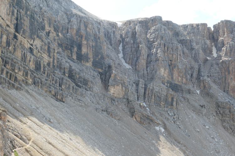 Unser Weiterweg zur Kalksteinwand unter der Forcella Nives. Der Klettersteig führt etwas links der senkrechten Schneerinne hoch