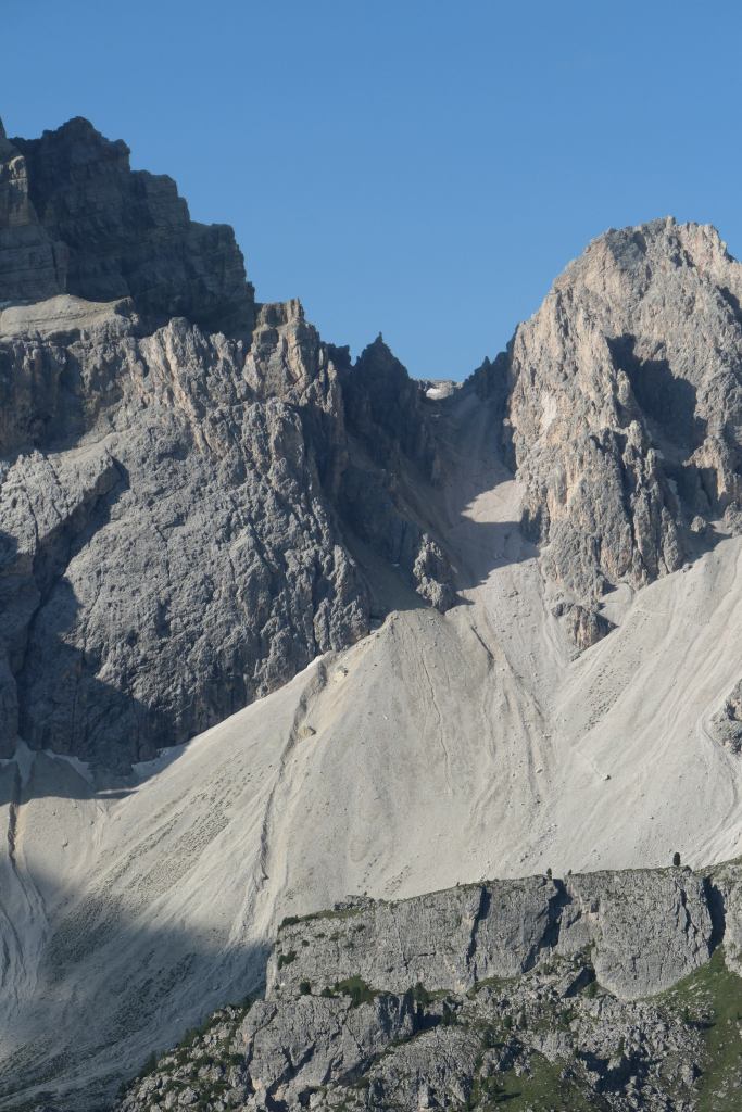 Blick in die Roa-Scharte vom Kreuzjoch. Unser (sehr steiler) Wegverlauf hinauf in die Scharte ist hier mit gutem Auge bereits erkennbar.