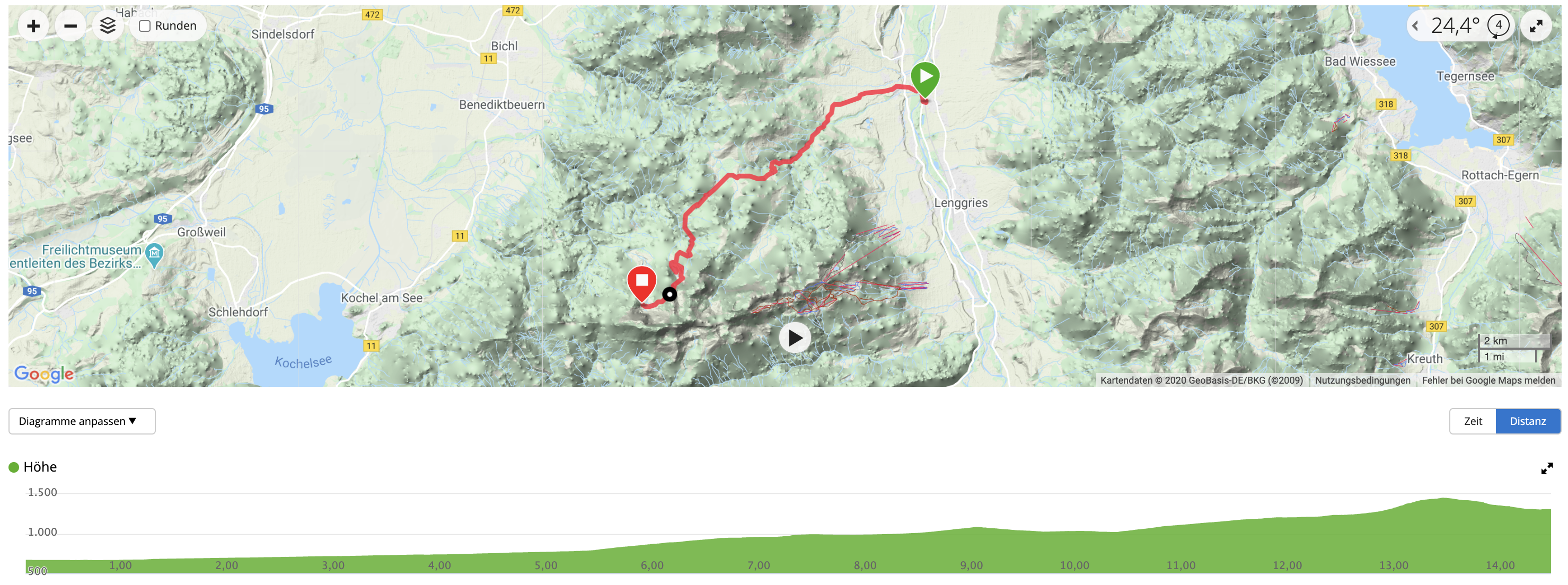 Man erkennt, dass wir uns die 3 ersten Etappen bis nach Obergries (südlich Bad Tölz) erspart haben. Dies ist aber schlicht vor allem meiner eigenen Jahres-Urlaubsplanung geschuldet, die zumindest etwas Reserve lassen sollte. Gleichermaßen werden wir auch am Ende noch einmal die (feucht-heißen) 3 Flachetappen zwischen Revine bzw. Tarzo und Jesolo aus unserer Tour „streichen“ und haben dafür lieber 2 Ruhetage auf unseren Alpen-Etappen eingebaut.