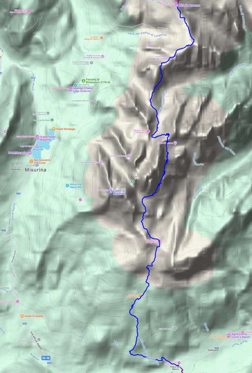 Vom Rifugio Auronzo galt es heute, die wilde Cadini-Gruppe der Dolomiten zu durchqueren. Auf deren Südseite lag tief im Ansiei-Tal unser heutiges Tagesziel, der urige Landgasthof „Corte’s Ranch„.