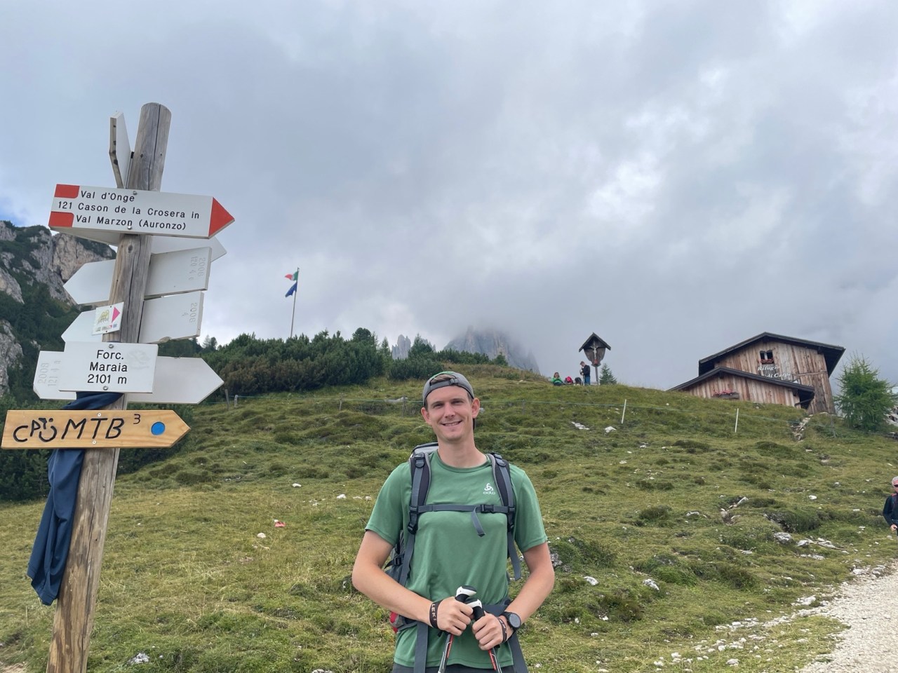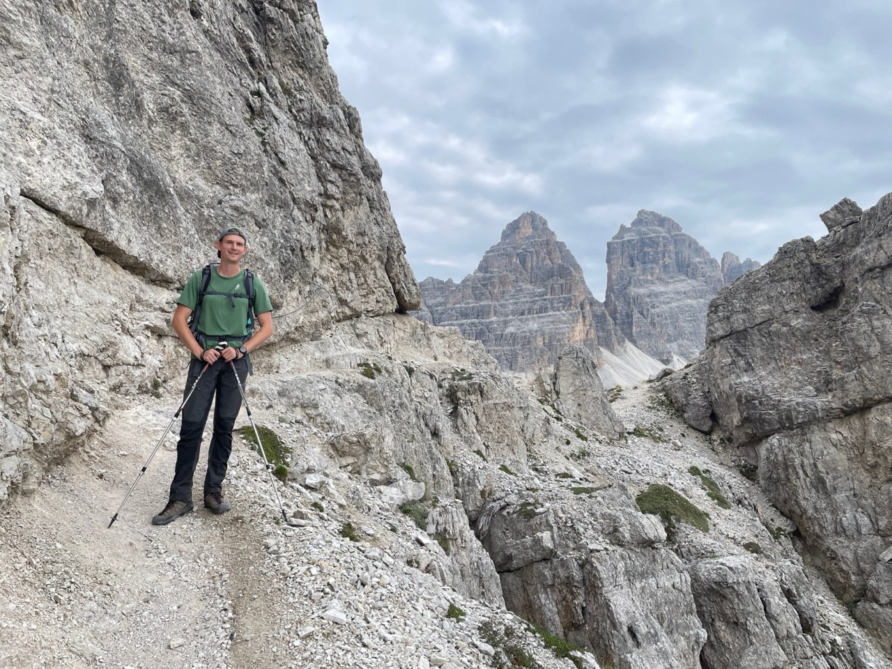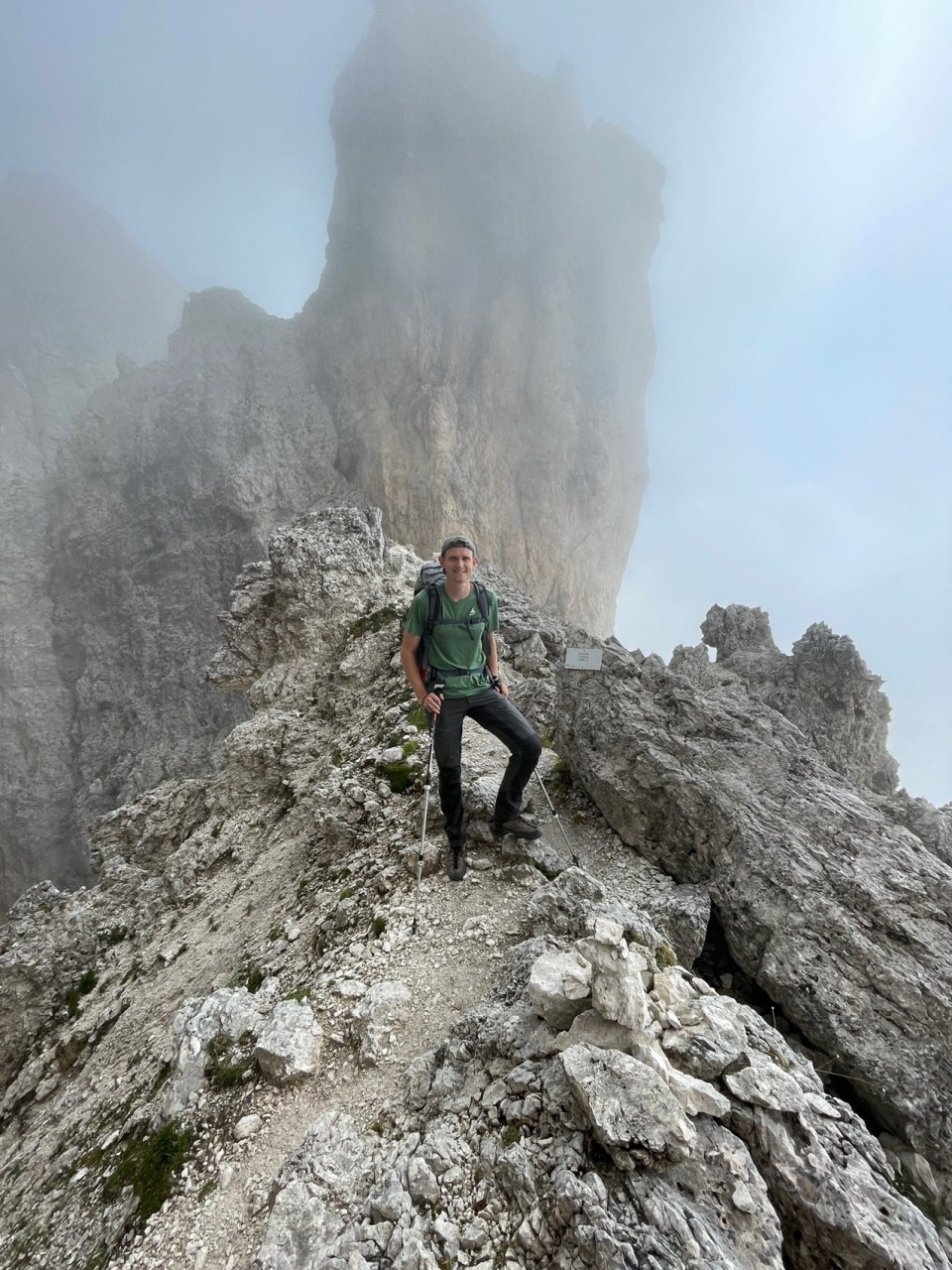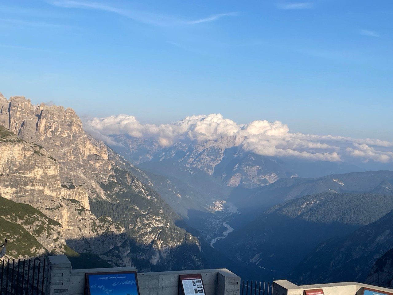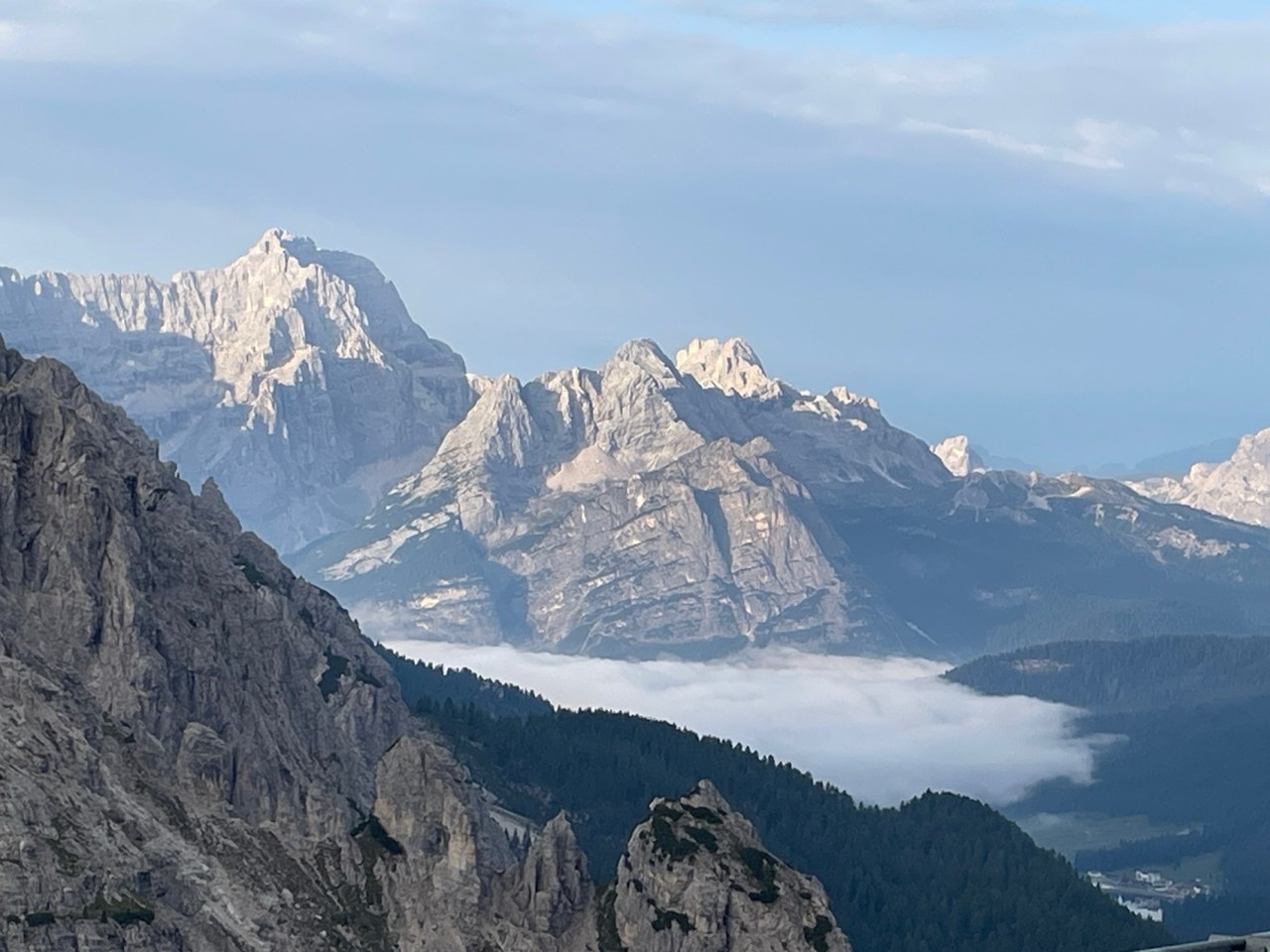 Ausblick gestern Abend aus dem Speiseraum der Auronzo-Hütte in südöstlicher Richtung nach Auronzo und den dortigen Lago di San Caterina…..und hier der gleiche Blick in Richtung Auronzoheute früh von der Forcella Longeres, knapp südlich vom Rifugio AuronzoUnd hier der Ausblick vom Rifugio Auronzoheute früh nach Südwesten, zum Misurina-See (unter der tiefen Wolkendecke) und zur Sorapis-Spitze (links oben)Schlüsselstelle am Bonacossa-Klettersteig (Sentiero A. Bonacossa): Der fast senkrechte Charakter dieser Stelle kommt auf dem Bild leider nicht herausDer Sentiero Bonacossa bietet aber grundsätzlich und überwiegend auch herrliche Passagen (wie hier im Bild), die sehr bequem zu gehen sind. Im Bildhintergrund sind hier noch ein letztes Mal die mittlere und die große Zinne der 3-Zinnen-Gruppe zu erkennenNach Erreichen der Forcella Rinbianco, teilte sich unser Weg (a) zum wunderbar gelegenen Rifugio Fonda Savio (oberhalb der Bildmitte am roten Dach erkennbar) und (b) zum Sentiero G.Durissini, dessen Ostvariante wir ab hier beschritten.Nach ultrasteilem Anstieg haben wir hier die nächste Forcella (Forc. della Torre) erreicht.Carsten am Kamm der Forc. della Torre. Ab hier geht’s am Sentiero G. Durissini Est zunächst wieder (typisch) sehr steil hinunter.Nach dem sehr steilen Abstieg aus der Forc. della Torre ist hier im Bild schon der steile Anstiegsweg zur nächsten Forcella (Cadin Deserto u. sofort danach die Forc. Sabbiosa) erkennbar…..auf dem kurzen Abschnitt zwischen den Forc. Cadin Deserto und Sabbiosa am Sentiero Durissini Est. Begegnungen gibt’s in dieser Einsamkeit immer nur sehr sehr selten, da man hier nur zu Fuß nach vielen Stunden Aufstieg hingelangen kann.Blick zurück von der vorletzten zur drittletzten Forcella am Sentiero Durissini Est. Das typische, konditionsfordernde Auf und Ab bei der Durchquerung von Berggruppen der Dolomiten ist aus den Bildern sicher recht gut erkennbar.Die letzte Forcella des Tages (Forc. Maràia) hatten wir am schönen Rifugio Città die Carpi (2120m – im Bildhintergrund oben rechts) erreicht. Hier gab’s für uns ein verdientes Gersten-Kaltgetränk, um uns für den ab hier noch ausstehenden 1000m-Steilabstieg (auf 4,9km Wegstrecke), hinunter ins Val di Ansiei etwas „aufzufrischen“.Nach rund 75min vom Rifugio Città di Carpi über die Maràia-Alm (Malga) tief hinunter ins heiße Val di Ansiei war schließlich unser Tagesziel, Corte’s Ranch, auf 1120m Höhe um 14:10h schon erreicht.