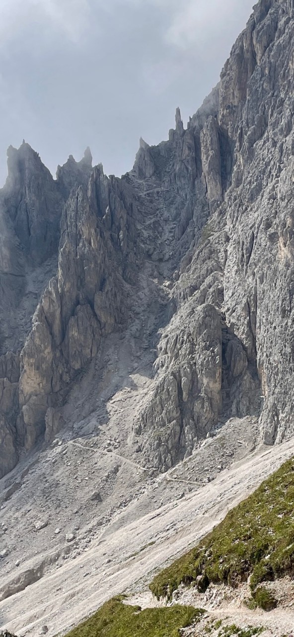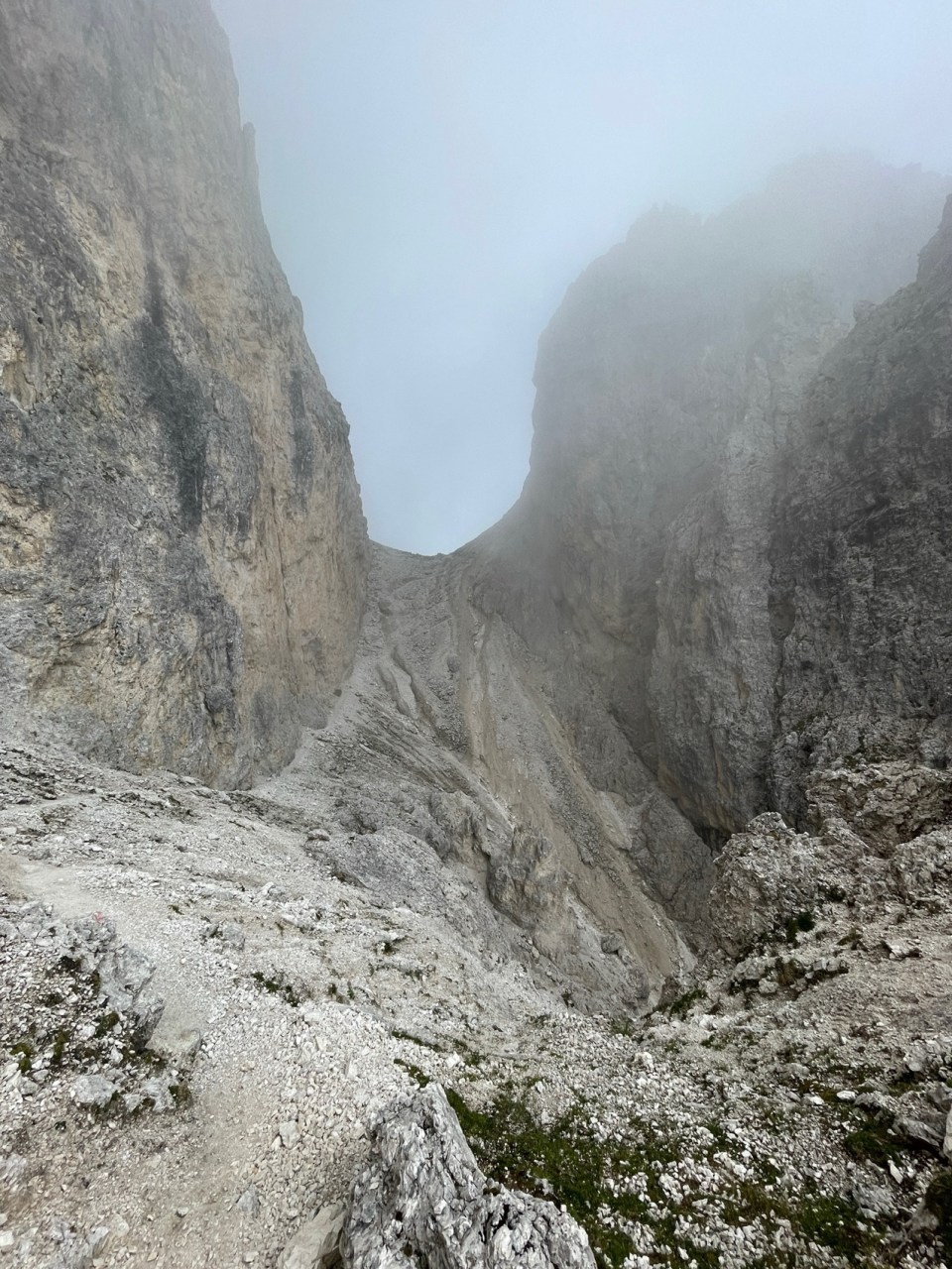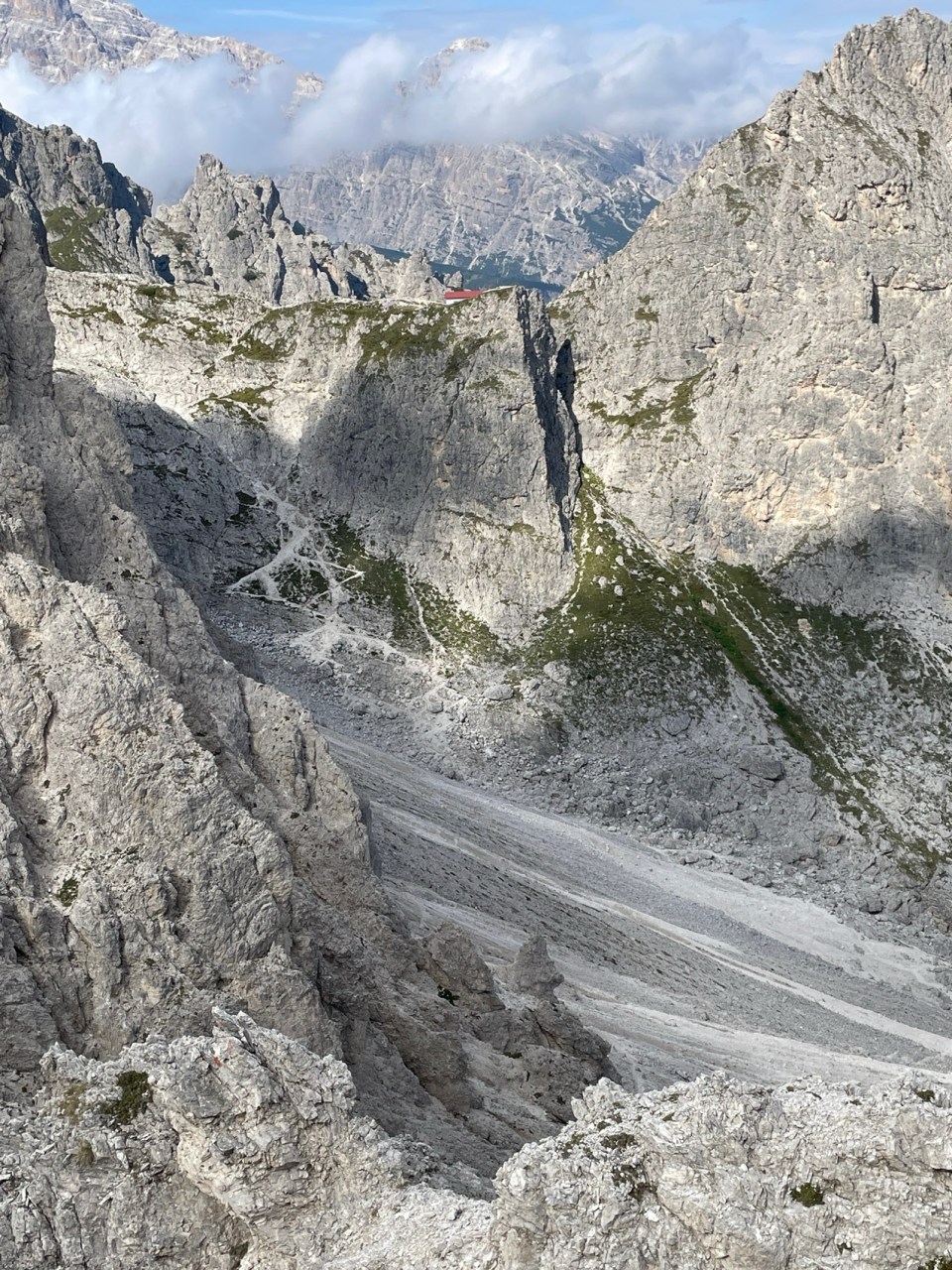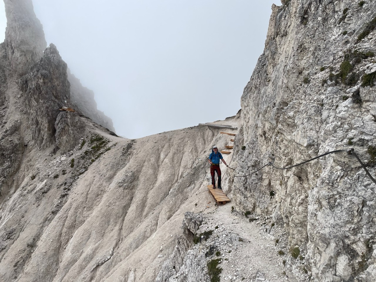 Auf dem Weg zu „unserer“ Ranch, tief im Tal, standen uns aber zunächst der Bonacossa-Klettersteig sowie danach zahlreiche Gebirgsscharten (italien.: ‚forcelle‘) im Weg, die es zu überschreiten galt. Die Überschreitung derartiger, meist nur kleiner Gebirgsscharten bedeutet in den Dolomiten zumeist unglaublich steile An- und Abstiege, so dass die heutig Etappe, trotz vergleichsweise kurzer Strecke, einige Herausforderungen mit sich brachte und auf Grund der vielen Gebirgsscharten auch „Tappa delle forcelle di montagna“ benannt werden könnte.