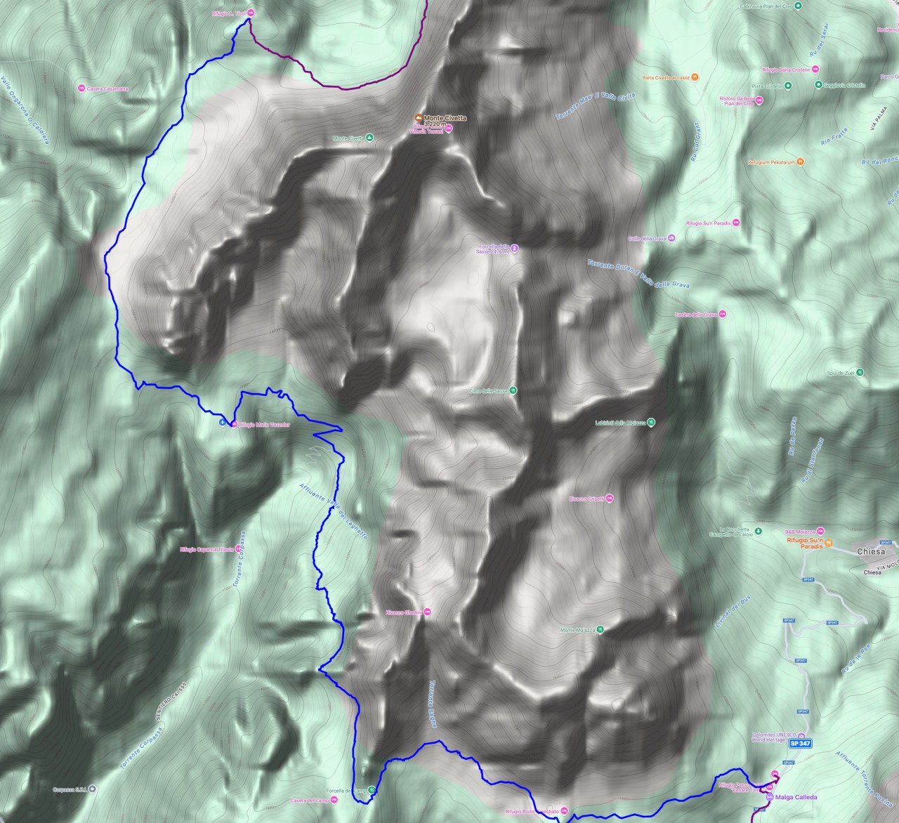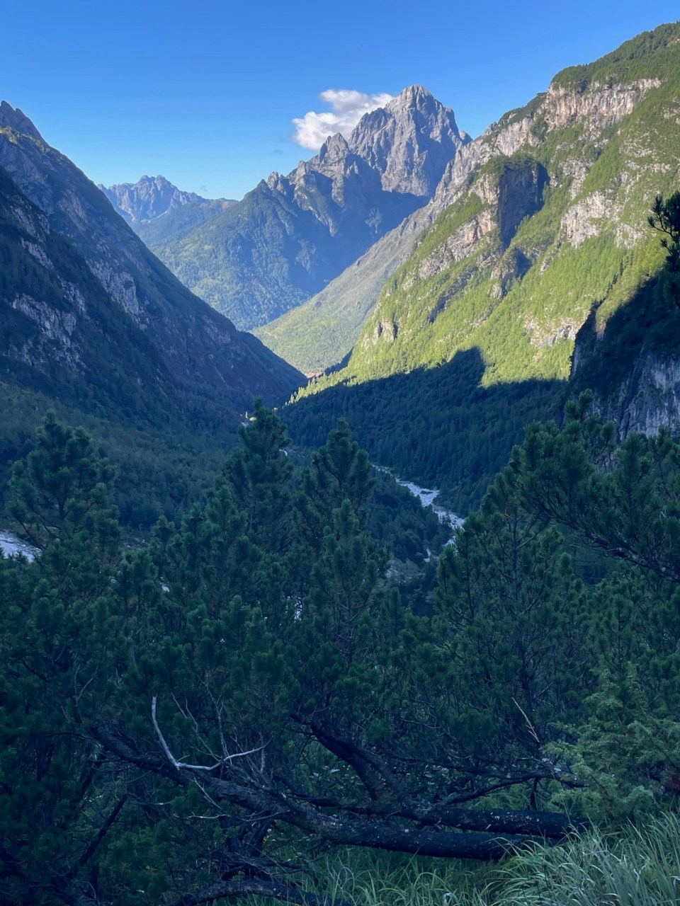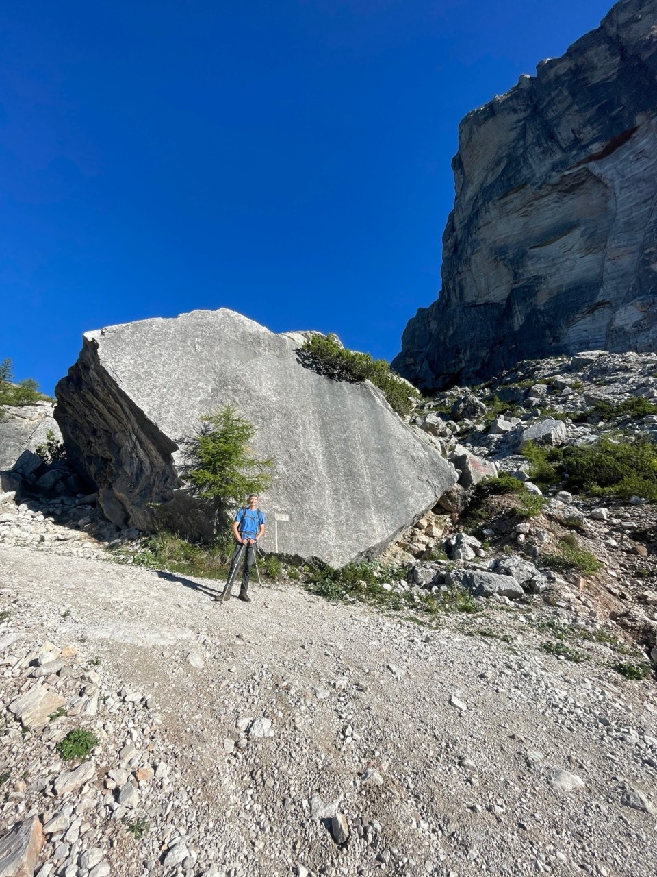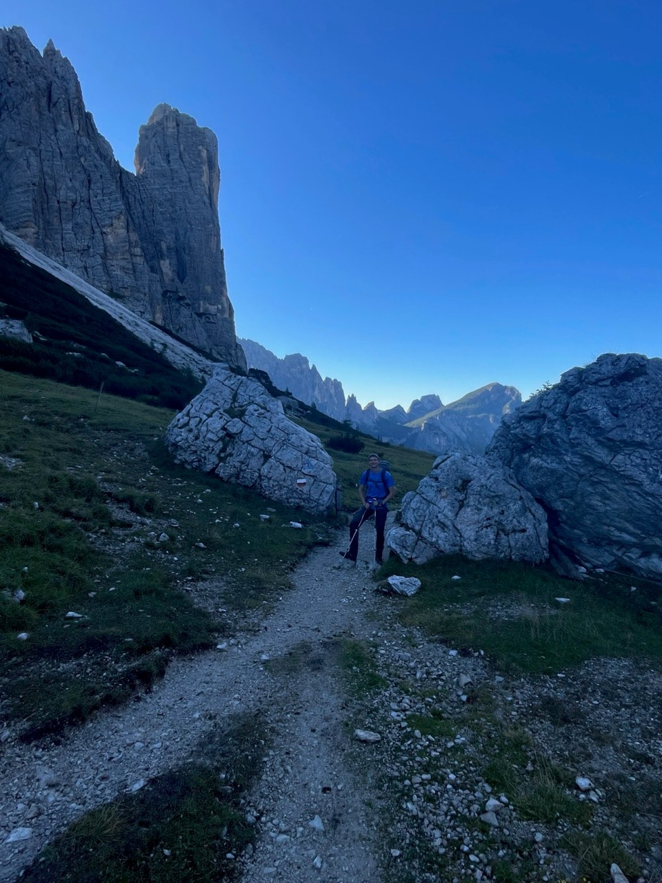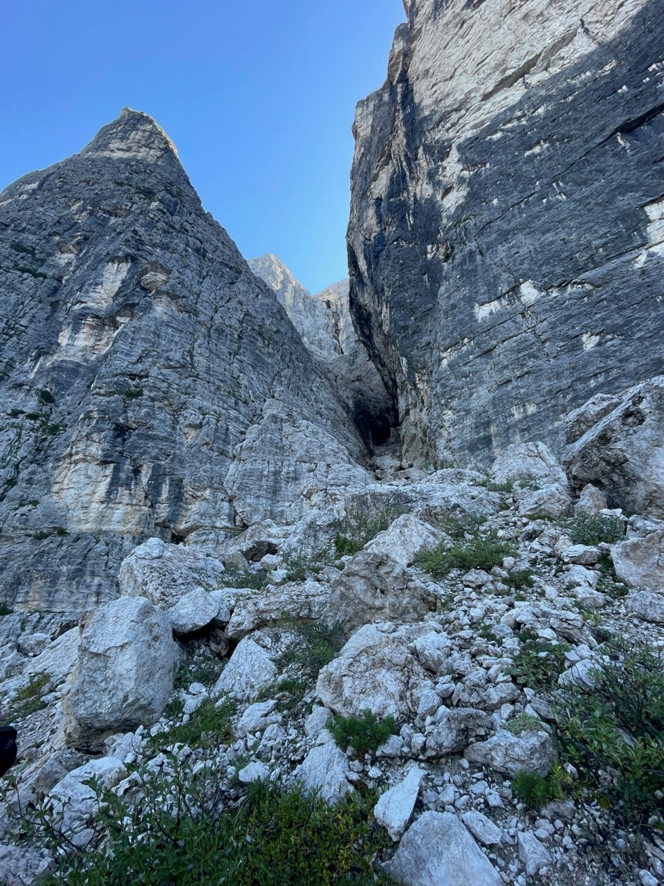 Die meisten Amerikaner, auch diejenigen, die deutlich eher gestartet waren, hatten wir nach spätestens 90min, d.h. am Rif. Vazzoler schon überholt. Im weiteren Verlauf gab es vor allem ein regelrechtes Schockerlebnis, als von der Moiazza Nord oder auch der etwas nördlich davon liegenden Cima di Nali (beide ca. 2800m), just als wir die senkrechten Felswände der Moiazza traversierten, kurz nacheinander 2 schwarze Skydiver(!!) mit gefühlten 300km/h, verbunden mit orkanartig anschwellenden Rauschen und einer davon nur ca. 50m über uns, fast senkrecht zu Tal schoss: Wahnsinn!!!