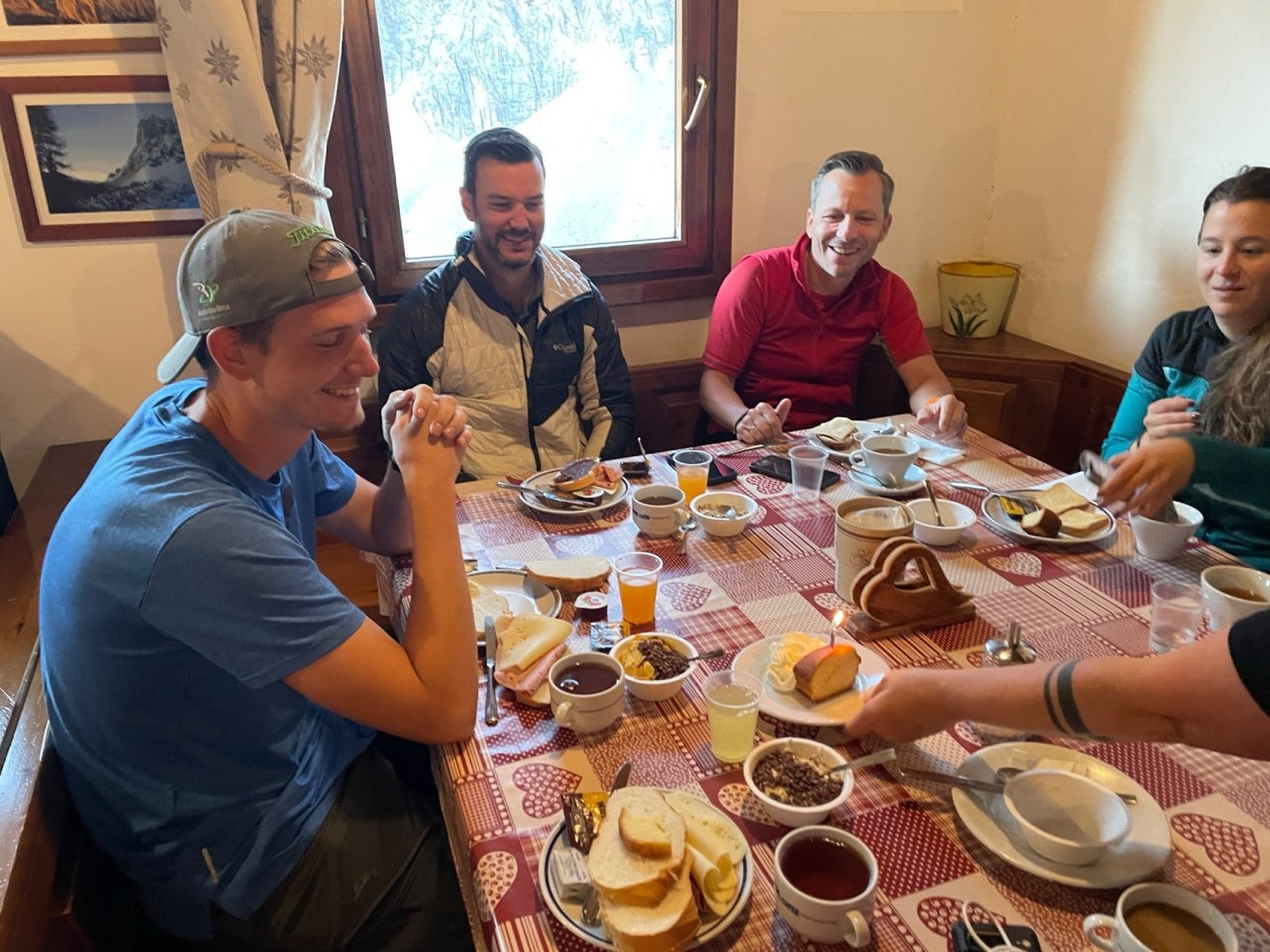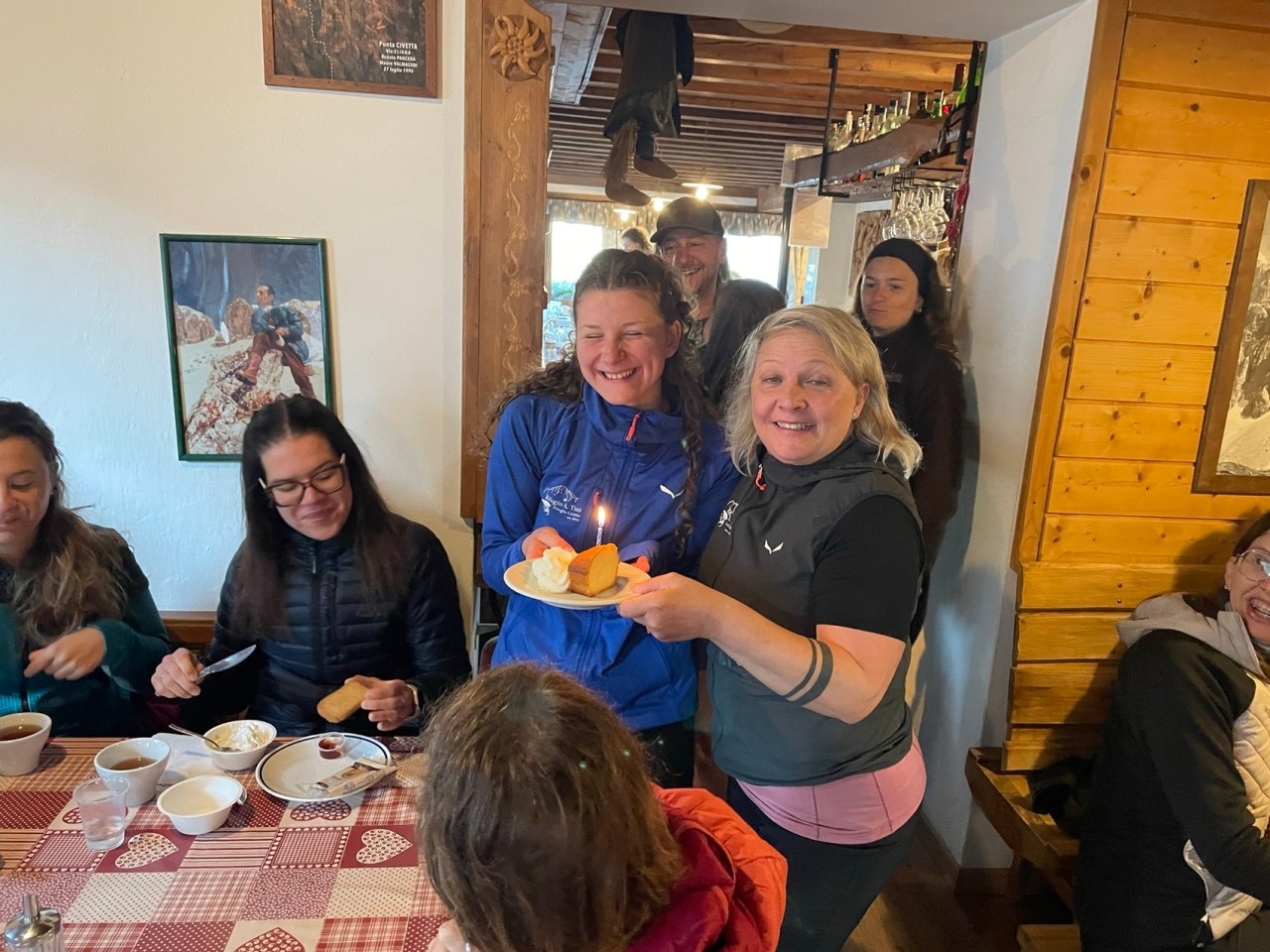 31.Aug.2025 – Carstens Geburtstag: Die Hüttenwirtin am Rifugio Tissi hatte ich bereits gestern vorbereitet: Zum Frühstück kam sie mit ihrer Tochter (in blau in der Bildmitte) so nicht nur mit einer Kerze und einem Stück Kuchen, sondern begleitete ihr Kommen zu unserem Tisch auch noch mit dem Lied „Happy Birthday...“, in das sofort die ganze Hütte einstimmte – äußerst beeindruckend und für Carsten eine gelungene, wenn auch wohl in Verlegenheit bringende Überraschung!