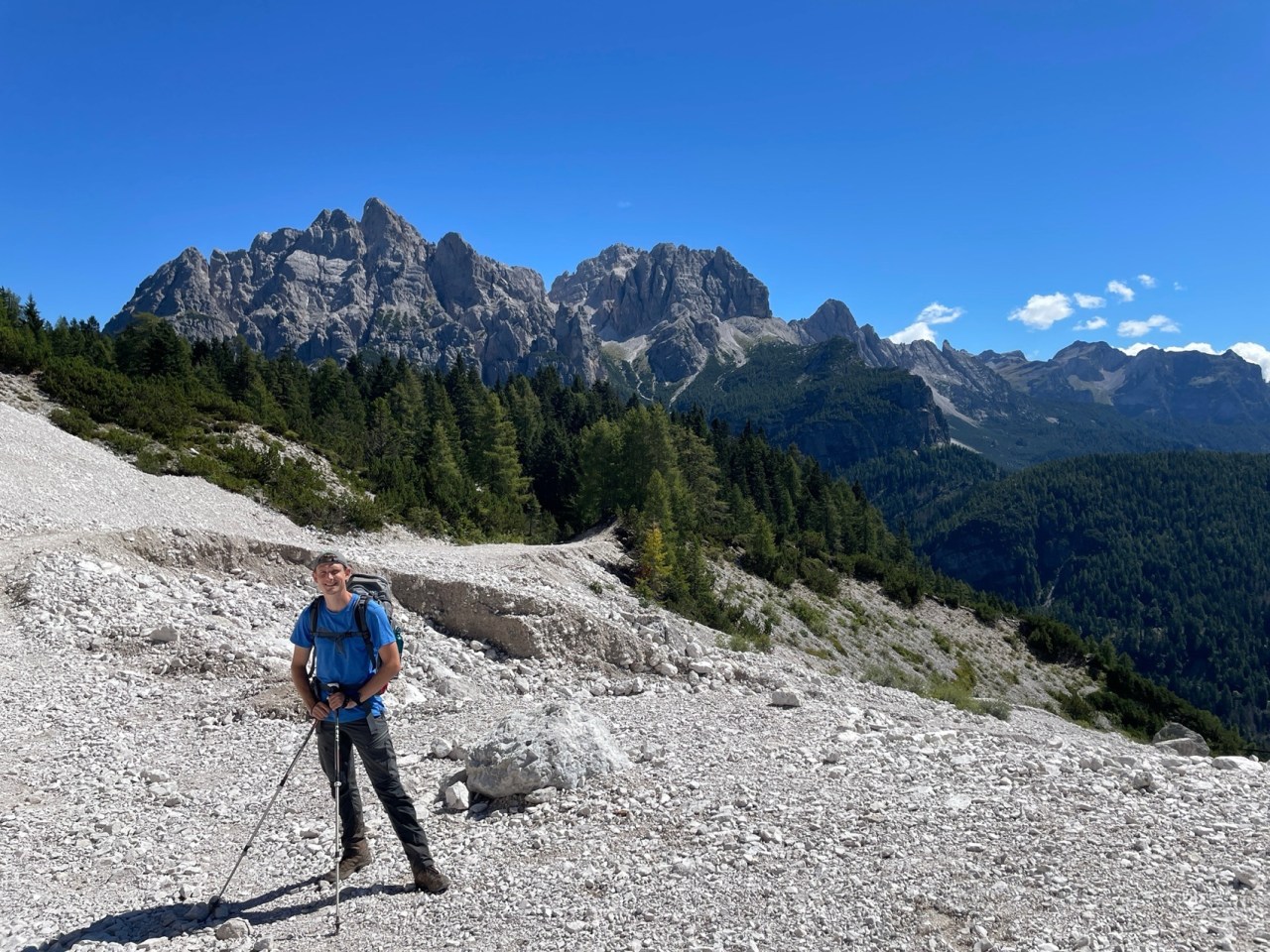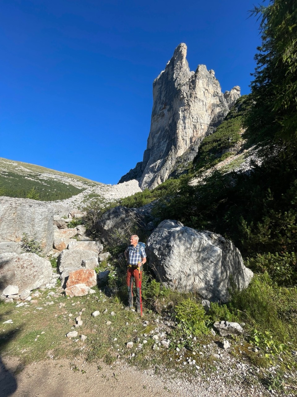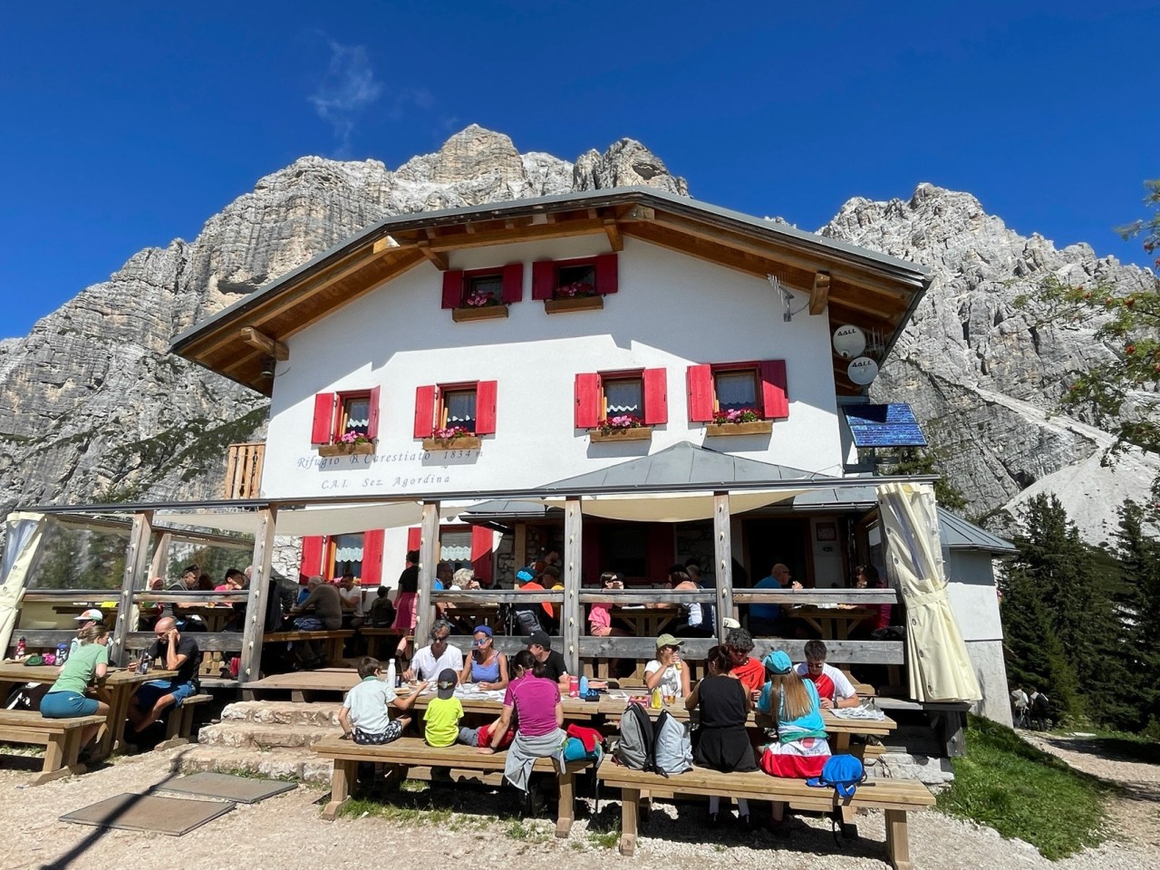 Geburtstagsüberraschung für Carsten mit Gesang heute früh im Rifugio TissiFrühstück mit Geburtstagskuchen und Kerze, inmitten amerikan. Freunde an unseren FrühstückstischRückblick heute früh auf das Rifugio Tissi am Col Rean vor der Civetta-NordwestwandAm Südrand der Civetta-Gruppe angekommen: Der Torre Venezia von NordenCarsten ist —wie schon 2020— immer noch klein im Vergleich zu diesem Monster-Stein unter dem Torre Venezia....Der Torre Venezia — diesmal von Süden: Ein beeindruckender „Felsenfinger„Der Monte San Lucano (2409m) aus Richtung der Südseite der CivettaUnsere steinerne Traverse unter den Westwänden der Moiazza vor der Scharte am Col d’Ors (in Bildmitte oben)Durch diese steile Schlucht von der Cima di Nali (2775m – links der Bildmitte, im Hintergrund) kamen die SkydiverRückblick von unserer Traverse unter den Westwänden der Moiazza, auf die Südseite der Civetta. Ganz links, der Torre Venezia, hinter dem wir von der Tissi-Hütte herkamenDie Pause zur Auffrischung am Rifugio Bruto Carestiato, vor der Cima Catedrale (2557m) der Moiazza haben wir heute wegen „Überfüllung“ gestrichenZwischen Rif.Carestiato und Passo Duran: Blick nach Süden auf die letzten Dolomitenregionen vor dem Mittelmeer – unsere Zielregion der kommenden TageAm Ziel, vor den Rifugio San Sebastiano, am Passo DuranDer 2.Geburtstagskuchen des Tages (nach dem ersten bereits zum Frühstück) als Belohnung nach der Tour heute