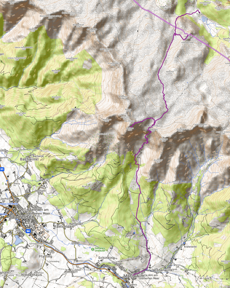 Ohne große Pausen ging es daher dann von hier aus im immer schlimmeren Starkregen noch gut 80min hinunter nach Maria Alm, auf 800m ü.NN, wobei wir noch ca. 700m Höhenunterschied zurücklegten.