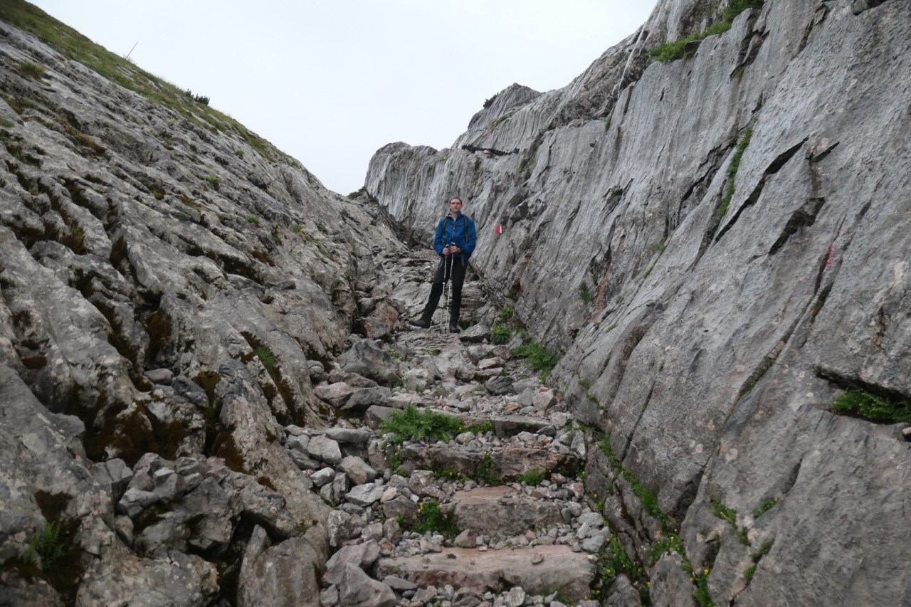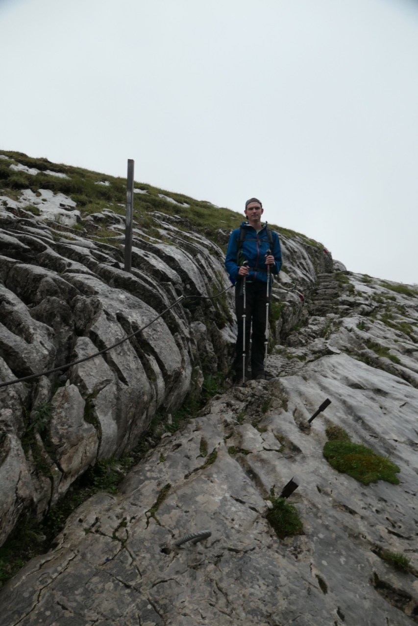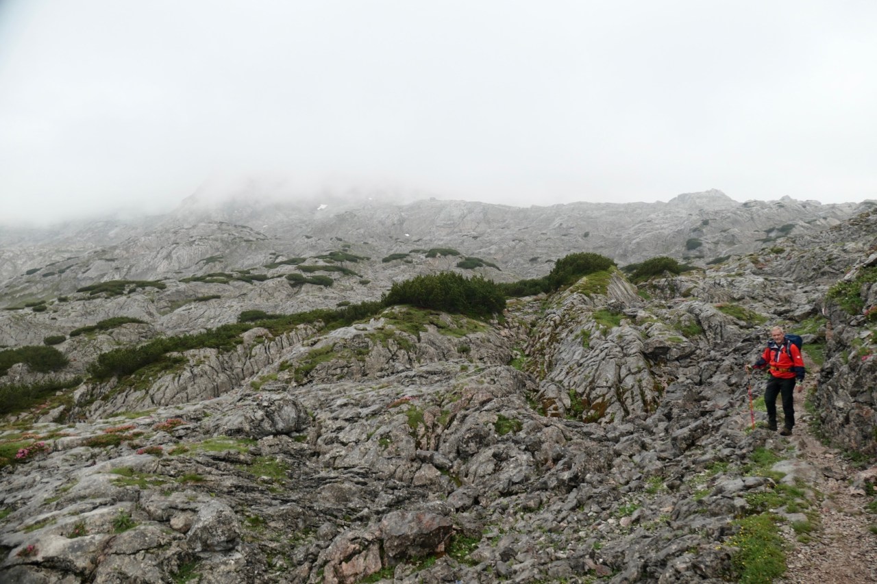 Wegen der zahlreichen Seilversicherungen im oberen Bereich wollten wir hier unbedingt vor möglichen Gewittern vorbei sein. Die Entscheidung fiel insofern für einen sehr frühen Start, d.h. Frühstück um 06:00h und Abmarsch um 06:45h. Zu diesem Zeitpunkt fing es am Funtensee bereits leicht, aber mit Unterbrechungen an, Regenschauer zu geben. Also beschleunigten wir etwas im Tempo und waren so bereits nach 2h anstatt der angegebenen 3h am Riemannhaus bzw. an der Ramseider Scharte. Erfreulicherweise war der 2. Teil der Überschreitung des Steinernen Meeres dabei wieder weitestgehend trocken und wir konnten danach auch noch einen trockenen und zügigen Abstieg über den Ramseider Steig in der Südwand des Steinernen Meeres machen.