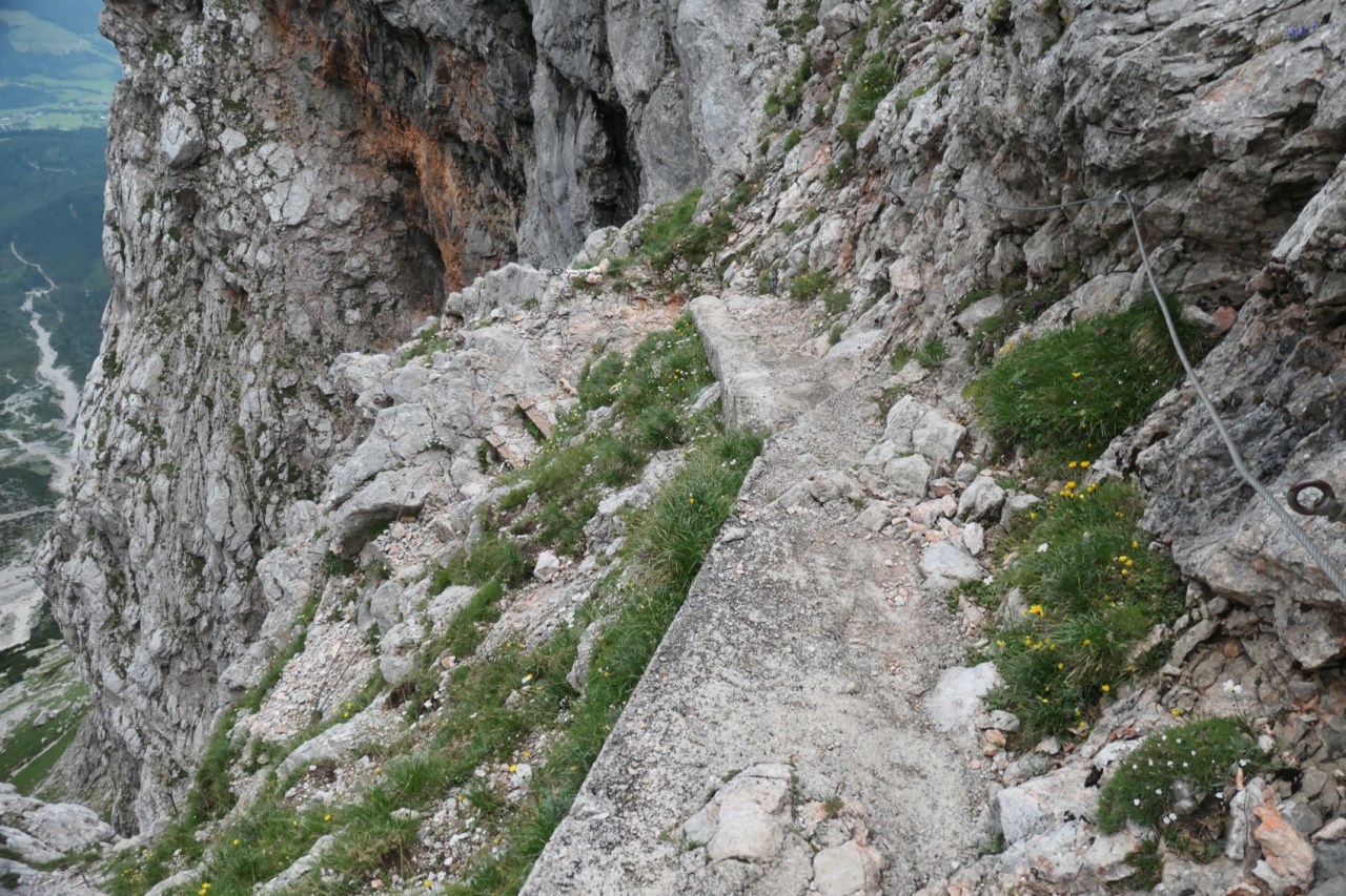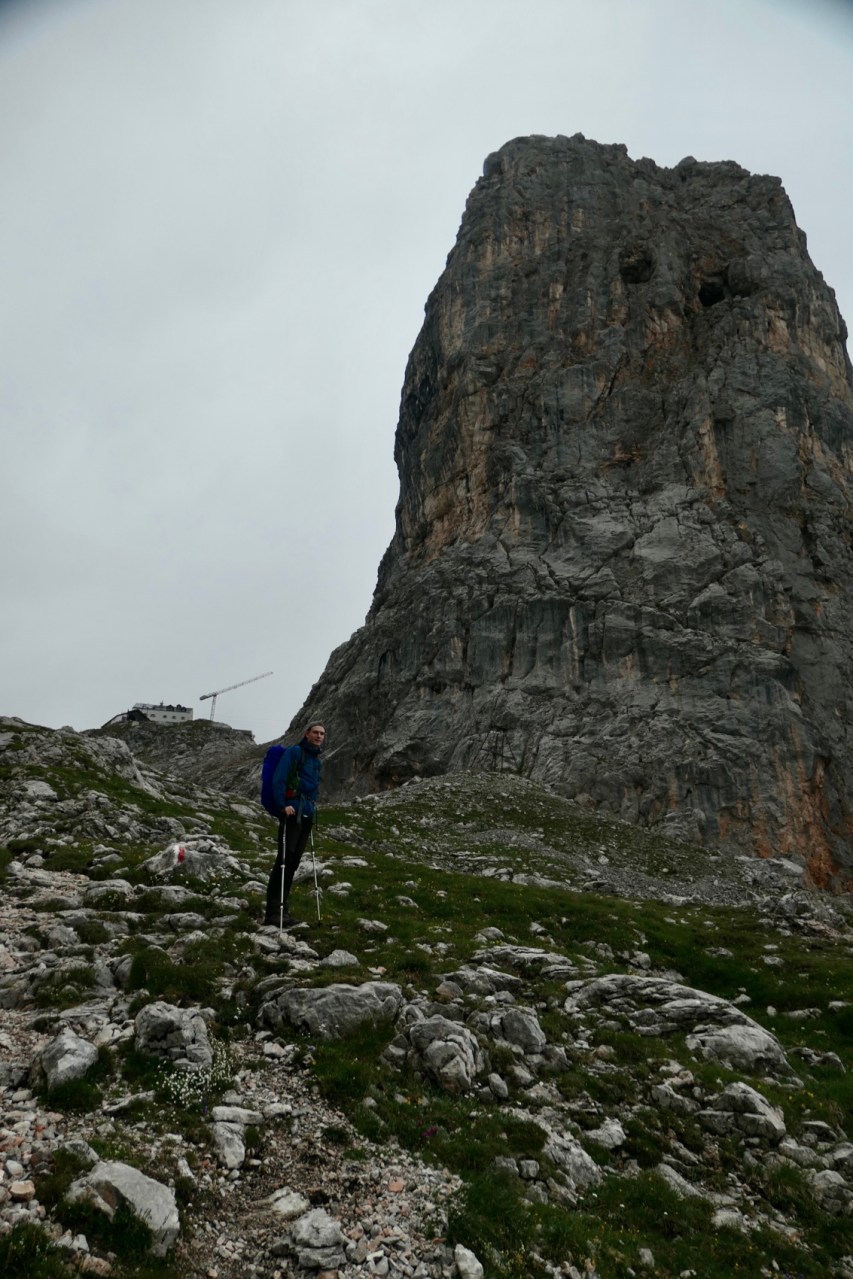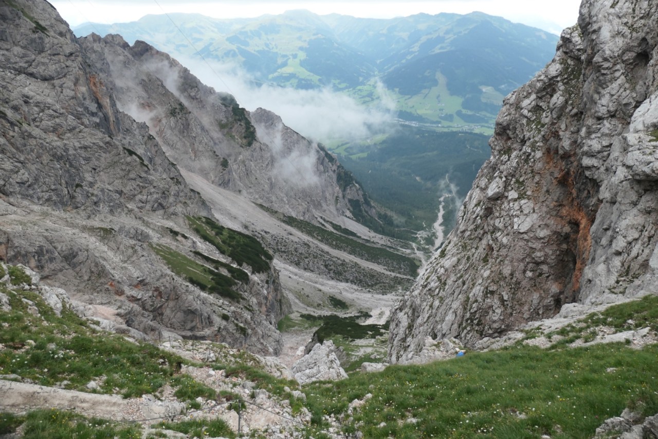 Wegen der zahlreichen Seilversicherungen im oberen Bereich wollten wir hier unbedingt vor möglichen Gewittern vorbei sein. Die Entscheidung fiel insofern für einen sehr frühen Start, d.h. Frühstück um 06:00h und Abmarsch um 06:45h. Zu diesem Zeitpunkt fing es am Funtensee bereits leicht, aber mit Unterbrechungen an, Regenschauer zu geben. Also beschleunigten wir etwas im Tempo und waren so bereits nach 2h anstatt der angegebenen 3h am Riemannhaus bzw. an der Ramseider Scharte. Erfreulicherweise war der 2. Teil der Überschreitung des Steinernen Meeres dabei wieder weitestgehend trocken und wir konnten danach auch noch einen trockenen und zügigen Abstieg über den Ramseider Steig in der Südwand des Steinernen Meeres machen.