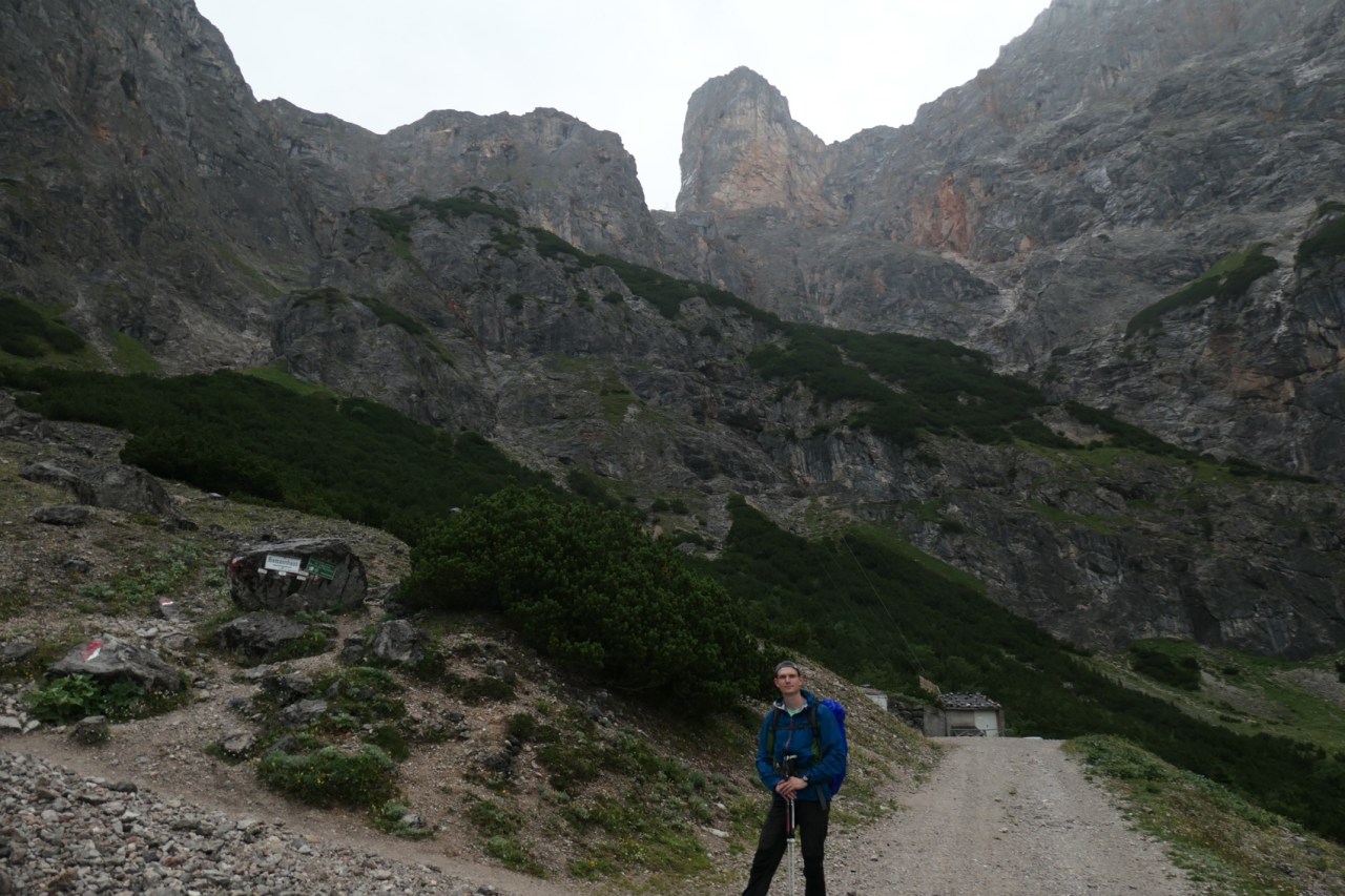 Der angedrohte Dauerregen kam dann aber schließlich doch zu uns und erreichte uns just, als wir den Wirtschaftsweg am Fuße der Materialseilbahn zum Riemannhaus auf ca. 1520m Höhe erreichten.