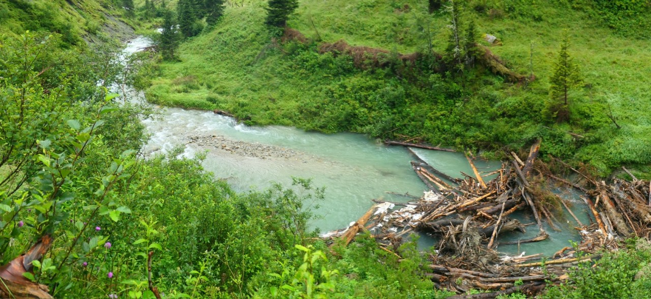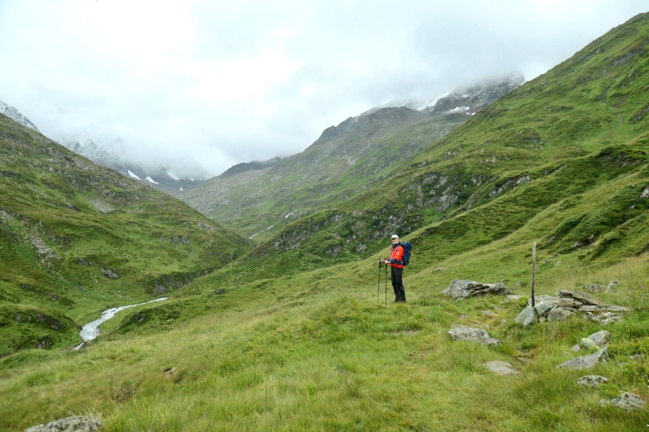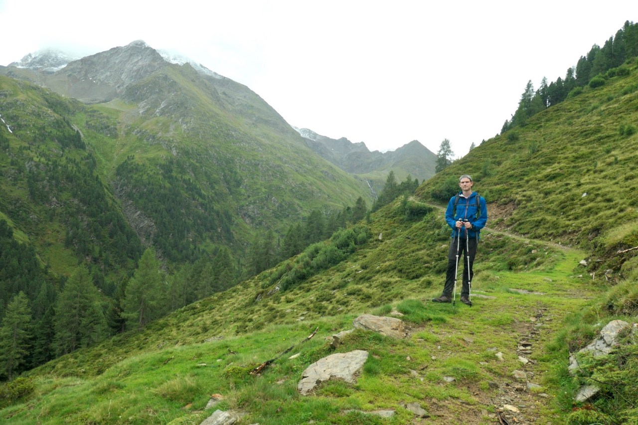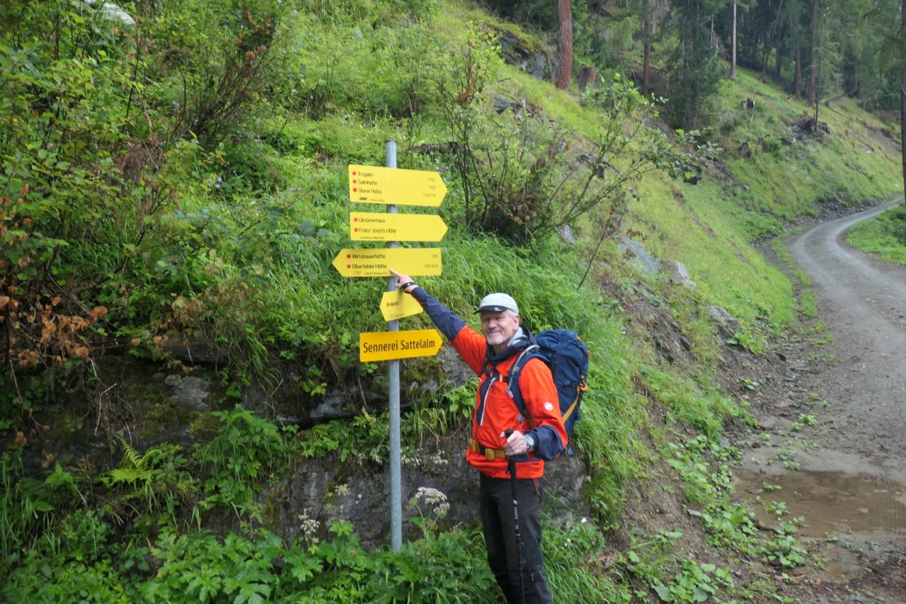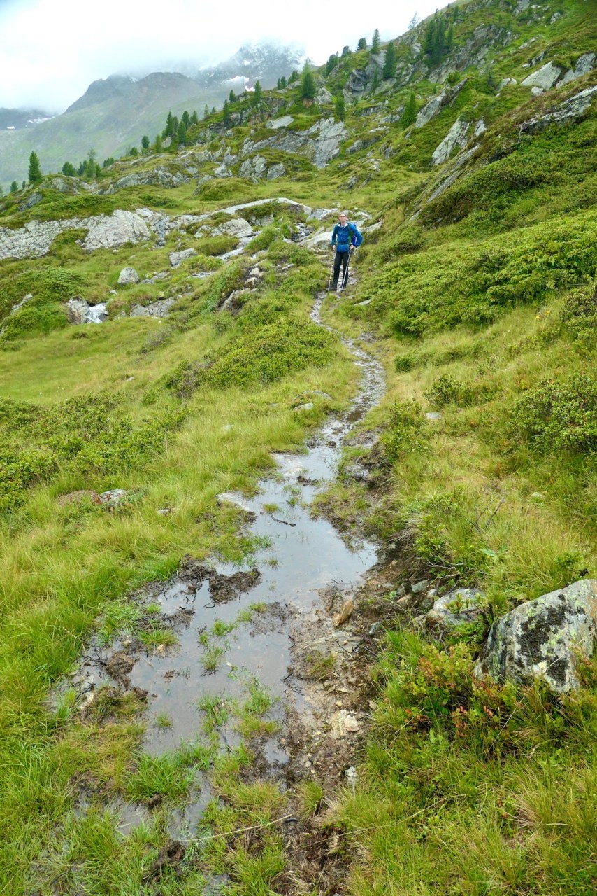 In der Tat waren die Regenbedingungen ab 09:00h erträglich und auch die Sturmböen am Glocknerhaus ließen schnell nach. Das Problem war heute eigentlich vielmehr, dass die Wanderwege, sofern kein Wirtschaftsweg, eher kleinen Bachläufen glichen und auch die Ausweichmöglichkeiten auf den Wiesen neben den Trails eher Sumpflandschaften glichen. Insbesondere auf den letzten 4km vor Erreichen der Hütte war für uns daher ein „Pfützenspringen“ angesagt, um nicht gänzlich nasse Schuhe und Füße zu riskieren.