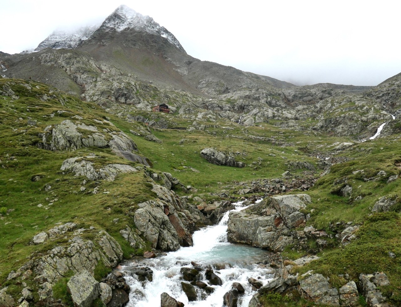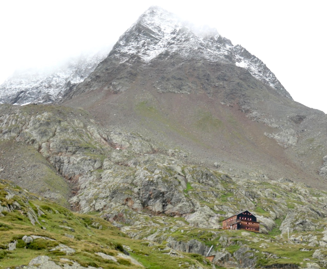 Wie erwartet hatte es in Verbindung mit dem langanhaltenden Regen seit gestern Abend in der Nacht bis ca. 2600m Höhe hinunter Schnee gegeben. Darüber hinaus waren eigentlich alle Berge oberhalb ca. 2800m ständig in Wolken und es regnete weiter. Angesichts dieser Situation hatten wir bereits gestern Abend entschieden die ursprüngliche Routenplanung, die uns am Gernot-Röhr-Biwak auf dem Kesselkeessattel bis auf 2930m Höhe geführt hätte, zu verwerfen und stattdessen den direkten Weg durch das Gößnitztal zur Elberfelder Hütte zu gehen. Schweren Herzens mussten wir damit dann auch auf die Besteigung des „Bösen Weibl“ (3120m) verzichten, da es auf dieser Höhe allein in der Nacht schon ca. 40cm(!) Neuschnee (laut Hüttenwirt) gegeben hatte.