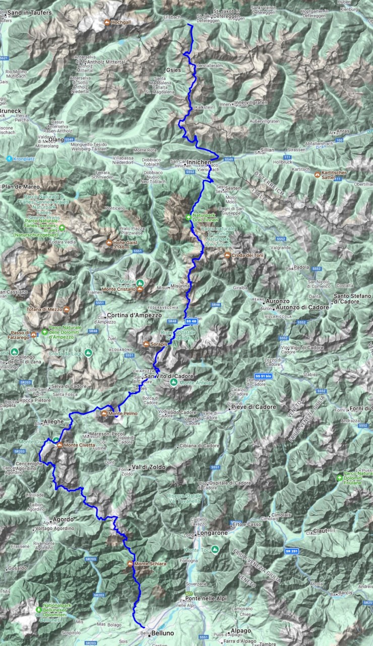 Nach etwas Recherche im Internet und Kontakten zu erfahrenen Leuten wurden wir schließlich auf der tollen Website („www.dustyboots.blog„) von Christiane & Uli Schrempp fündig und entschieden uns dafür, die vielversprechende Route von Bayrischzell nach Belluno ins Auge zu fassen. Aktuelle Infos zu dieser Route hatte uns Uli Schrempp auch sehr schnell in Form eines in 2020 gerade neu aufgelegten kompakten Büchleins übersandt, so dass unsere Routenplanung recht einfach zu erledigen war. Die konkrete Planung unserer Tour soll nun im Sommer-2025 endlich realisiert werden, wozu sich unsere Planungsdetails wie gewohnt im Folgenden entnehmen lassen: