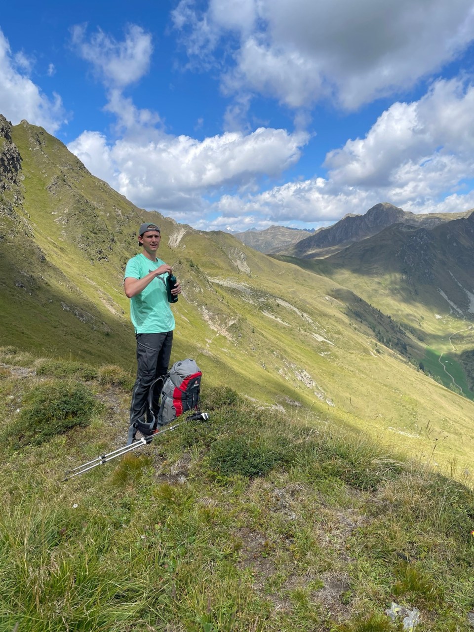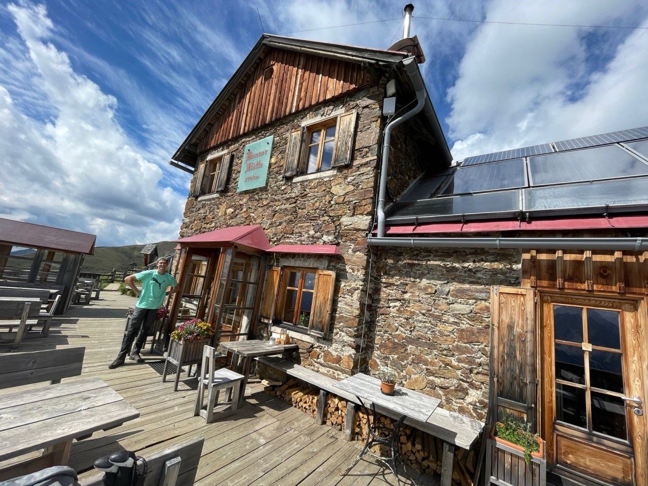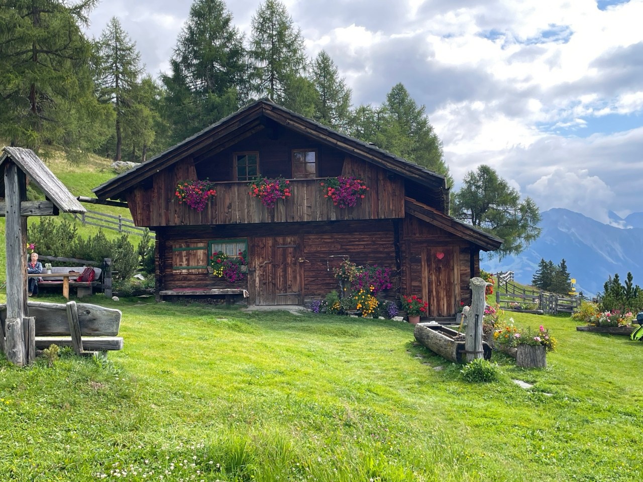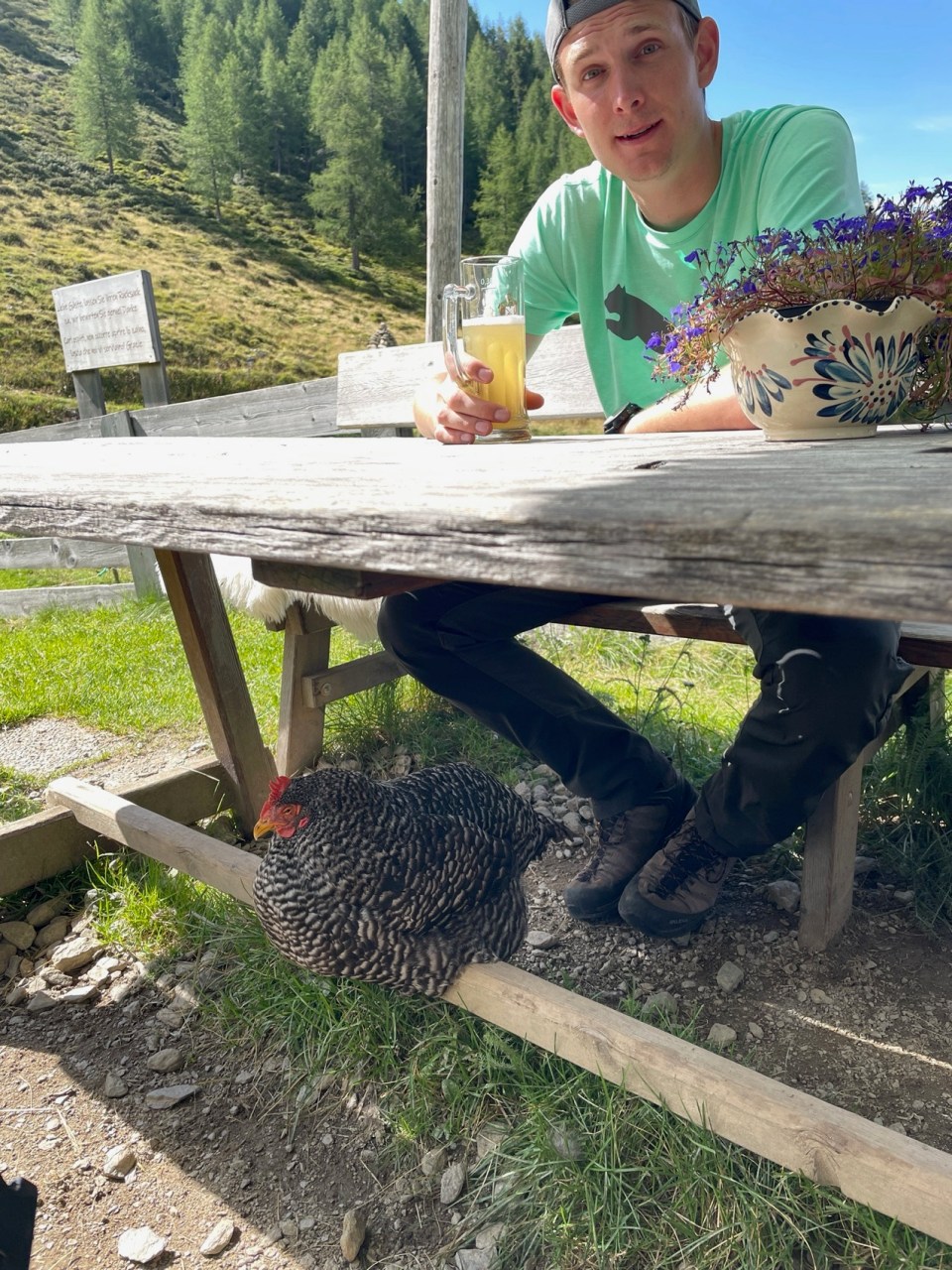 Regenerationstage im Virgental: Hier z.B. von der herrlichen GotschaunalmHerrliche Bergblumenwiese an der Gotschaun-AlmEin (fast) zahmes Rehkitz lief uns im Virgental auch über den Weg…..Start im Defereggental mit Carsten heute morgen um kurz vor 07:00hNach knapp 20min waren wir bereits an der sehr schön gelegenen Alpe Stalle, etwa 200m über unserem Start. Hier war so früh aber noch gar kein Betrieb.Blick zurück ins Defereggental nach ca. 1,5h in Richtung Lasörlinggruppe/Virgental. Hier sind wir bereits 750m über unserem StartpunktCarsten hat unseren höchsten heutigen Punkt, den Pfoisattel (2625m), ca. 1120m über unserem Start nach ca. 2,5h erreicht. Hier auf dem Pfoisattel beginnt der Bonner Höhenweg, der immer an der italienisch-österreichischen Grenze südwärts verläuft.Am Pfoisattel eröffnet sich nun auch ein herrlicher Blick ins Südtiroler Gsieser TalVom Pfoisattel ging’s für uns zunächst gut 500 Höhenmeter abwärts bis zur Pfoialm und anschließend wieder aufwärts weiter zur schönenKaseralm (2079m).An der Kaseralm bot sich für uns nach ca. 10km Strecke ein erster „Boxenstopp“ mit einem kühlen Radler an. Carsten hatte dabei unter dem Tisch ein Perlhuhn, dass seinen Platz auf keinen Fsll räumen wollteWeiter ging’s nach der Kaseralm dann wieder steiler hinauf zum Kalksteinjöchl. Am Kalksteinjöchl wechselten wir auf dem Bonner Höhenweg wieder auf die österreichische Seite des obersten VillgratentalesNach ca. 19km Strecke und bereits ca. 1700 positiven Höhenmetern im Auf und Ab begann es langsam anstrengender zu werden. Die Trinkpausen wurden daher häufiger. Im Hintergrund kann man unseren Höhenweg aus der oberen Bildmitte erkennenNach 20km ist der letzte Grenzwechsel (diesmal nach Südtirol) am Pfanntörl geschafft. Von hier aus geht’s nun auf den letzten 2km Weg nur noch ca. 200 Höhenmeter abwärts und dann ist unser Etappenziel, die Bonner Hütte erreichtAm Ziel für heute: Die kleine aber feine (alte) Bonner Hütte auf 2340m HöheDer Standort der Bonner Hütte bietet einen herrlichen Tiefblick auf Toblach (im Pustertal) und die Sextener Dolomiten. Dazu morgen mehr!…zunächst aber unser verdientes „After-Tour-Bier“ – man achte auf das Cover!