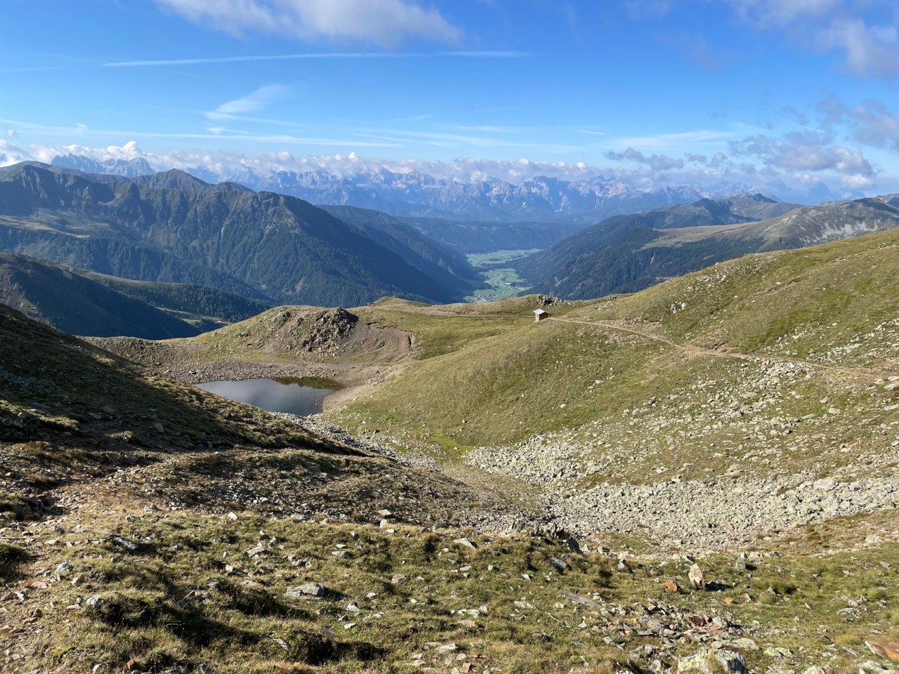 Etappe-11:Sankt Jakob i.D. – Bonner Hütte: Auf dem „Alten Bonner Höhenweg“ südwärts am Grenzkamm zwischen Südtirol (Italien) und Osttirol (Österreich) zur Bonner Hütte. hoch über dem Pustertal