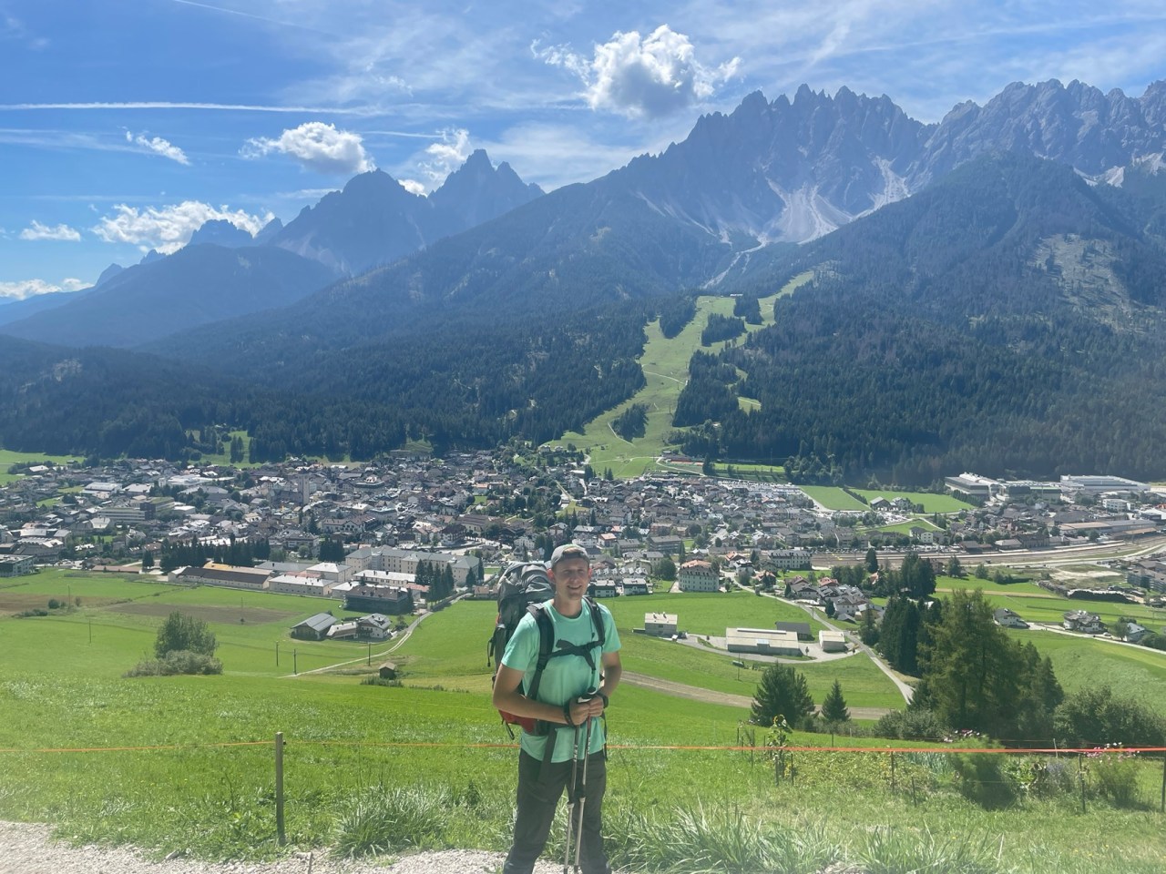 Die kleine Bonner Hütte am Toblacher Pfannhorn: Urgemütlich und mit äußerst freundlichen und hilfsbereiten GastgebernAusblick von der Hüttenterasse am Tourstart in Richtung Toblach: Die letzten Wolken sollten sich sehr schnell auflösenRückblick zur Bonner Hütte bei unserem Abstieg ins oberste PustertalBis zur Steinbergalm, nach einer guten Stunde, hatten sich alle relevanten Wolken bereits aufgelöst.Die urgemütliche, aber gegen 09:20h noch unbesuchte „Sylvesteralm“Ab dem Innicher Eck begann hier der sehr steile Abstieg ins PustertalCarsten vor der Kulisse von Innichen im PustertalEndlich sind die (Sextener) Dolomiten erreicht: Carsten im Innerfeldtal, nur noch 20min vor unserem TageszielBlick auf die Sextener Dolomiten mit Haunold (rechts der Bildmitte) und Dteischusterspitze (direkt links der großen Fichte. Exakt in Bildmitte sind am Horizont schon die 3 Zinnen zu erkennenDer Morgenkopf über dem hintersten Innerfeldtal von der Dreischuster-Hütte: Das Dolomitenpanorama ist hier sensationell!!Unser Tagesziel, die Dreischuster-Hütte mit kleiner Kapelle davor